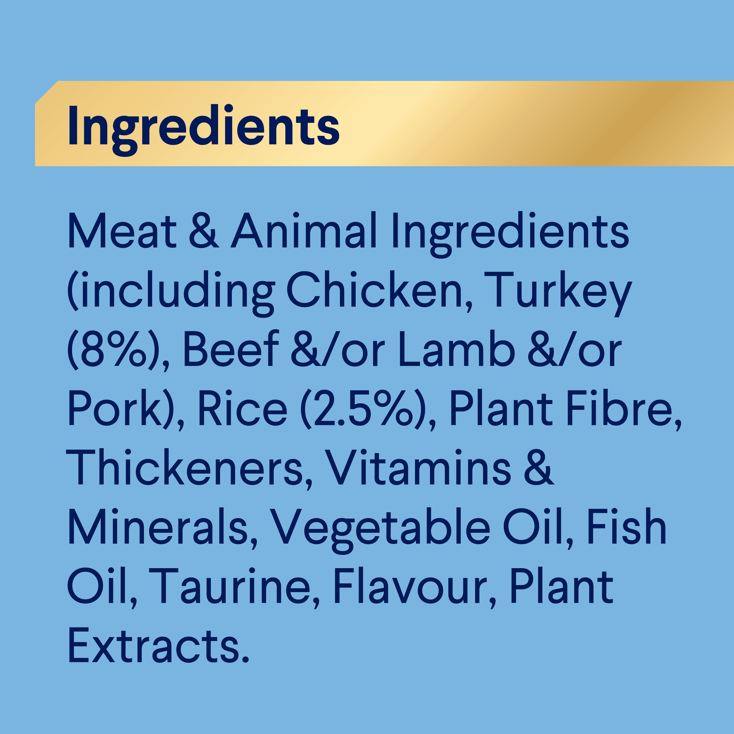 Meat & Animal Ingredients (including Chicken, Turkey (8%), Beef &/or Lamb &/or Pork), Rice (2.5%), Plant Fibre, Thickeners, Vitamins & Minerals, Vegetable Oil, Fish Oil, Taurine, Flavour, Plant Extracts.