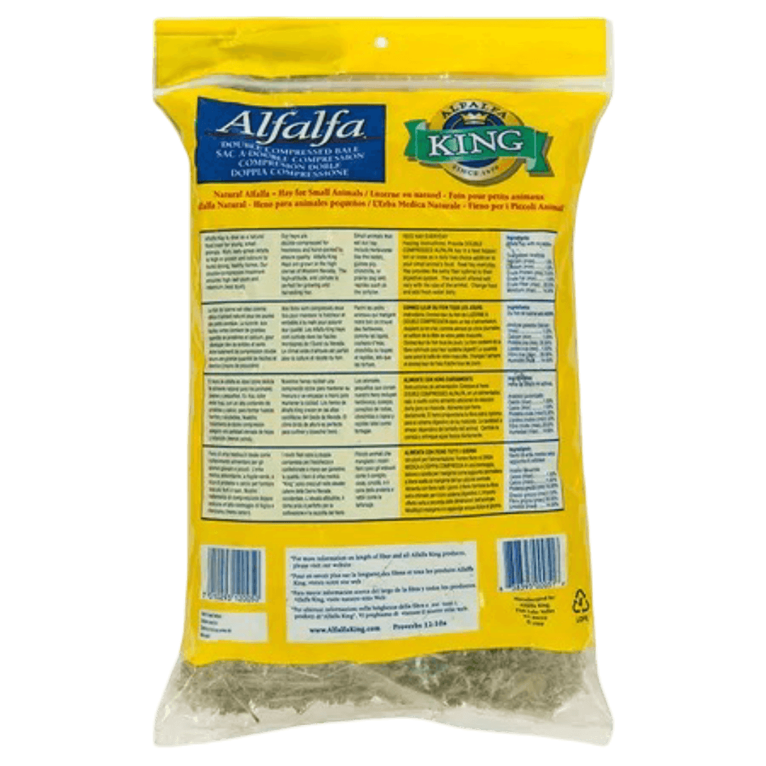 Alfalfa King Alfalfa Hay compressed bale is a natural food treat for young, small animals. Rich in protein and calcium, it builds strong bones. Double-compression ensures high leaf count and retention