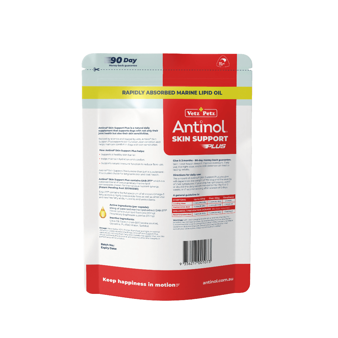 The Antinol Skin Support Capsules For Small Breed Dogs is a daily supplement designed to nourish your dog's skin and coat from within. This all-natural formula uses a patented blend of marine lipid oils, sustainably sourced from New Zealand, to help maintain hydration and strengthen the skin's barrier.