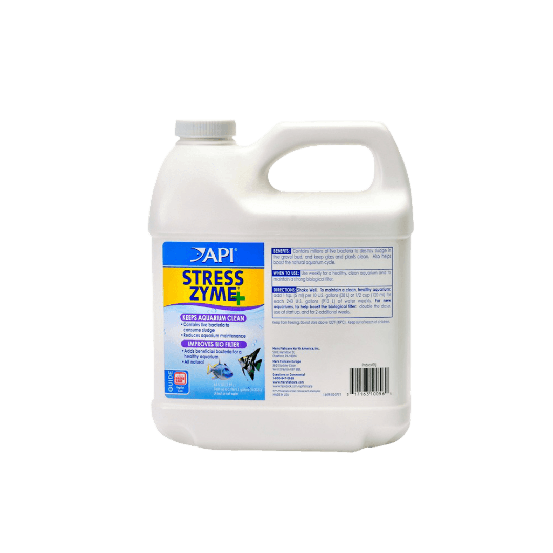 The API® STRESS ZYME bacterial cleaner is a powerful solution containing over 300 million live bacteria per teaspoon, designed to break down sludge and minimize aquarium maintenance. This cleaner promotes a healthy biological filter, ensuring a clean aquarium, healthy fish, and optimal water quality in both fresh and saltwater environments.