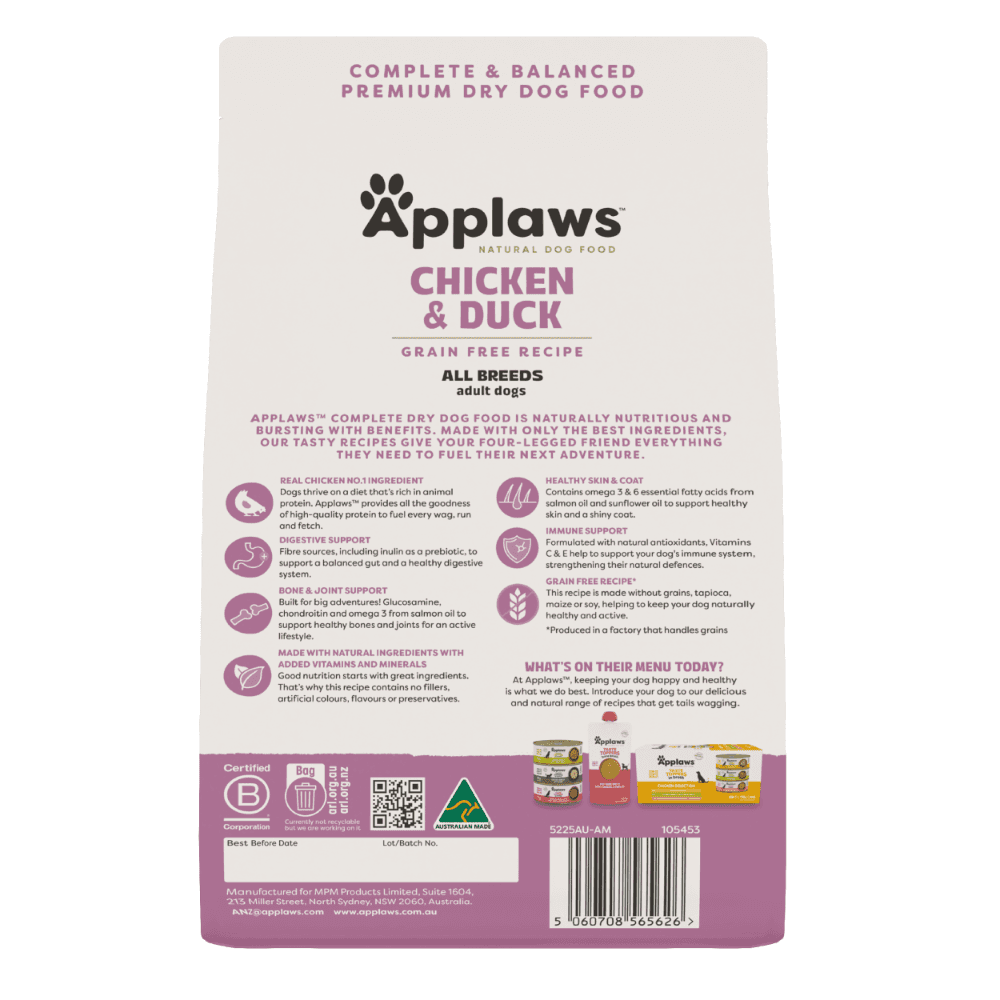 Applaws Duck Grain Free Adult Dry Dog Food is a premium, high-protein kibble designed to provide complete and balanced nutrition for adult dogs of all breeds. This natural recipe prioritises high-quality animal proteins and avoids grains to support optimal digestion and overall vitality in active pets.