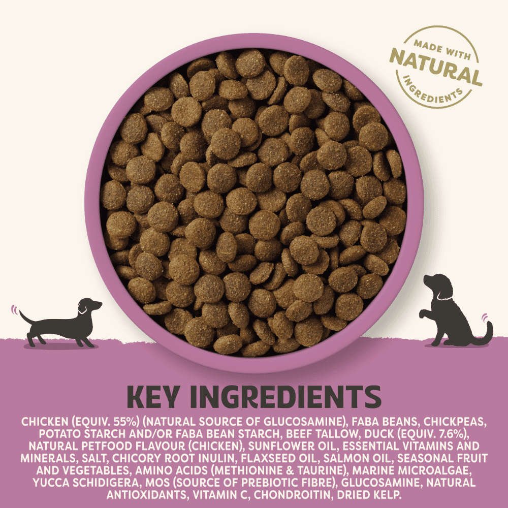 - Glucosamine and chondroitin are included to support joint health and mobility in active adult dogs