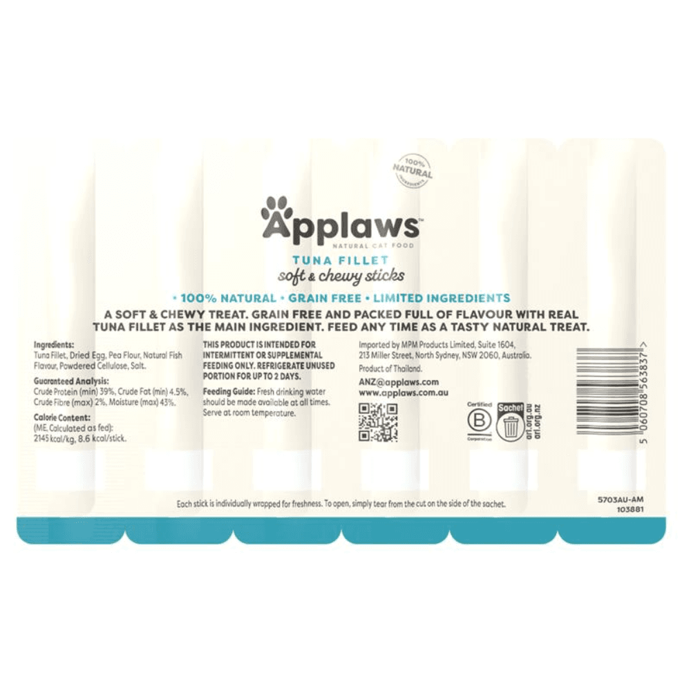 Applaws Soft and Chewy Sticks Tuna Fillet Cat Treat are a naturally irresistible treat crafted with real tuna fillet as the first ingredient. These grain-free, soft-textured sticks are ideal for cats who prefer a more tender chew and are made with limited, wholesome ingredients to support a natural diet.