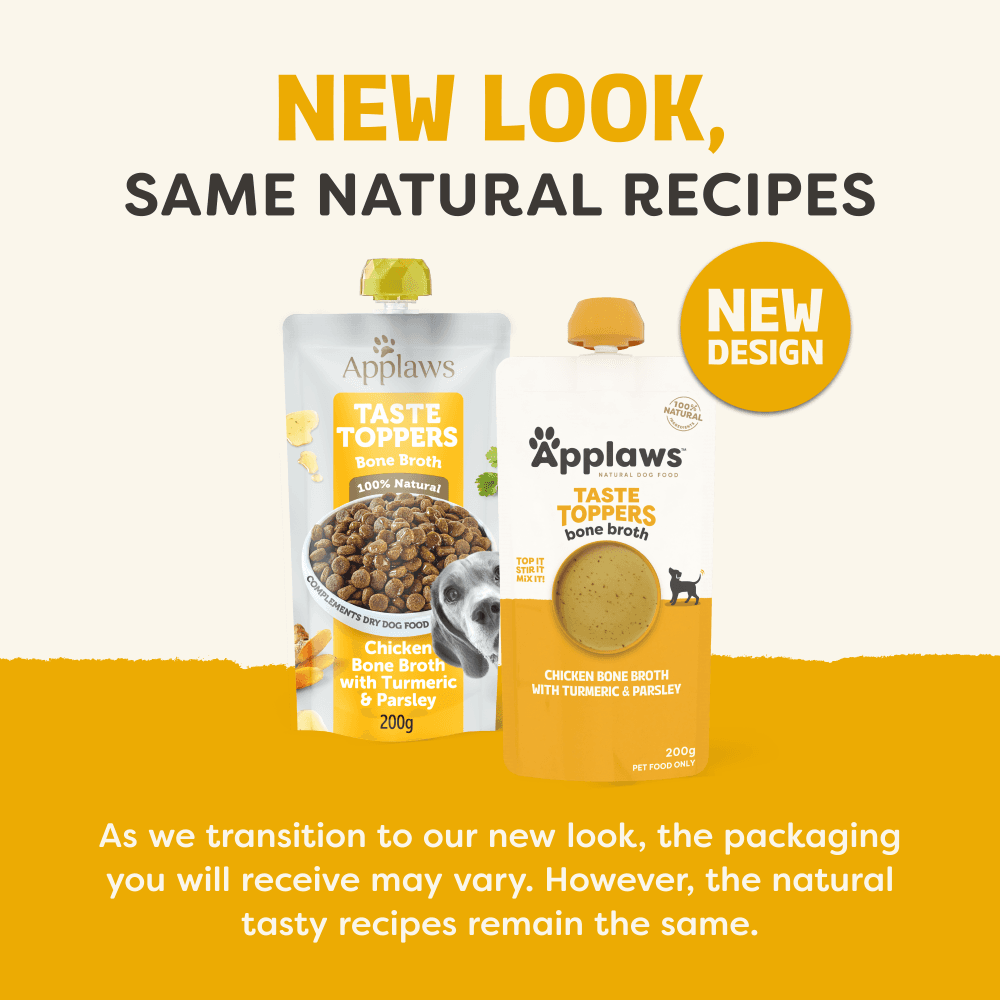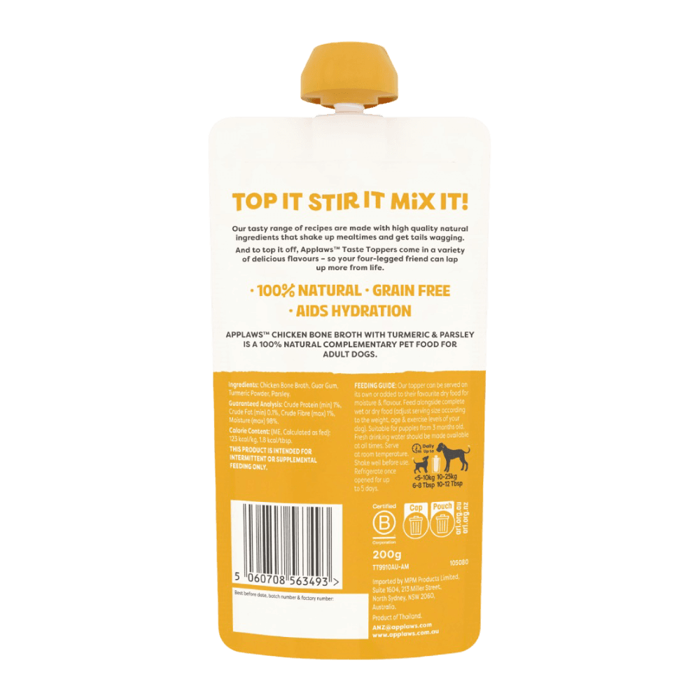Applaws Taste Toppers Chicken Bone Broth Turmeric And Parsley Broth For Dogs is a flavour-packed, all-natural meal topper designed to enhance your dog's everyday dinners. Easy to pour and made with wholesome ingredients, this broth adds moisture, nutrition, and irresistible taste to dry food.