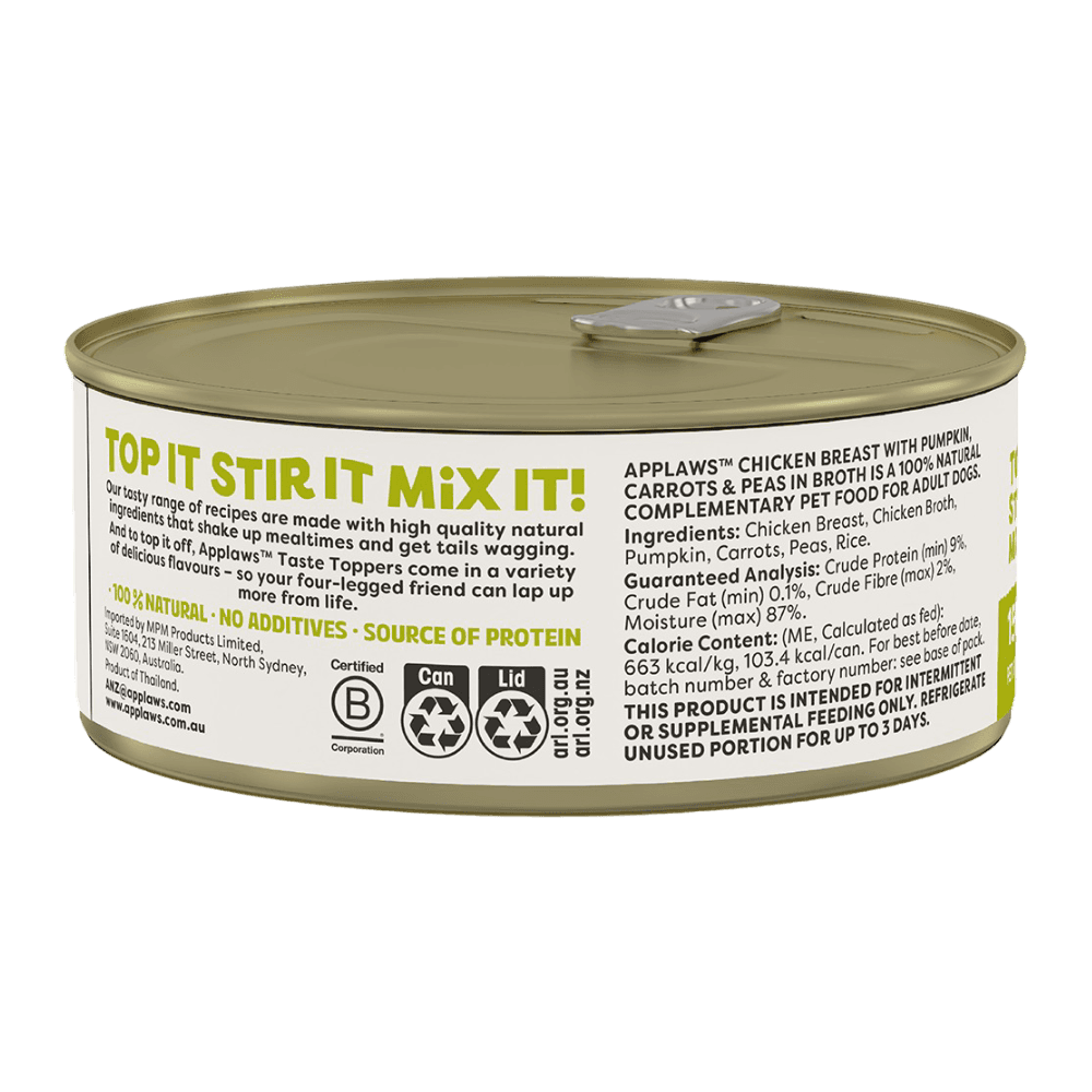 Treat your furry friend to a culinary delight with Applaws Taste Toppers Chicken Breast with Vegetables in Broth! This delectable wet dog food combines tender chicken breast with nutritious vegetables in a savoury broth, providing a flavourful and wholesome meal.