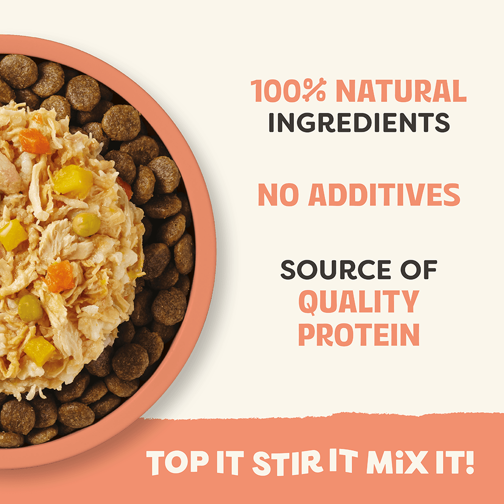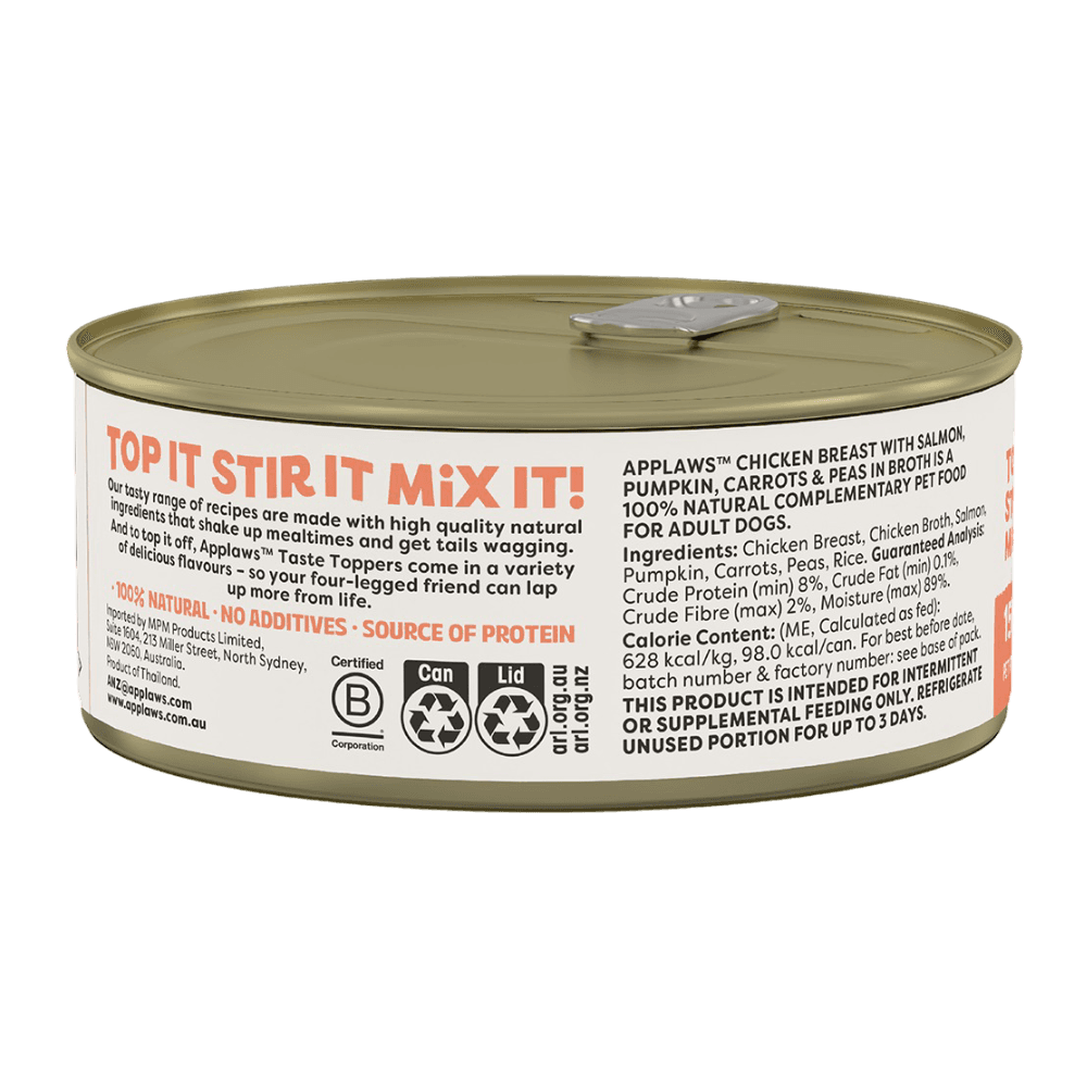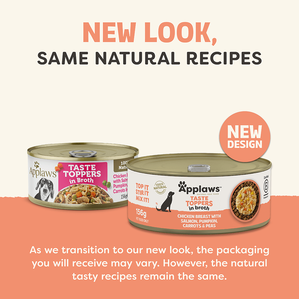 Applaws Taste Toppers Chicken Breast & Salmon Dog Food Topper treats your pup to tender chicken, succulent salmon and veggies all swimming in a tasty broth. Made with simple, wholesome ingredients, it's designed to bring a burst of flavour and excitement to your floof's everyday meals. Perfect as a topper or mix-in, it turns an ordinary bowl into something worth wagging about.