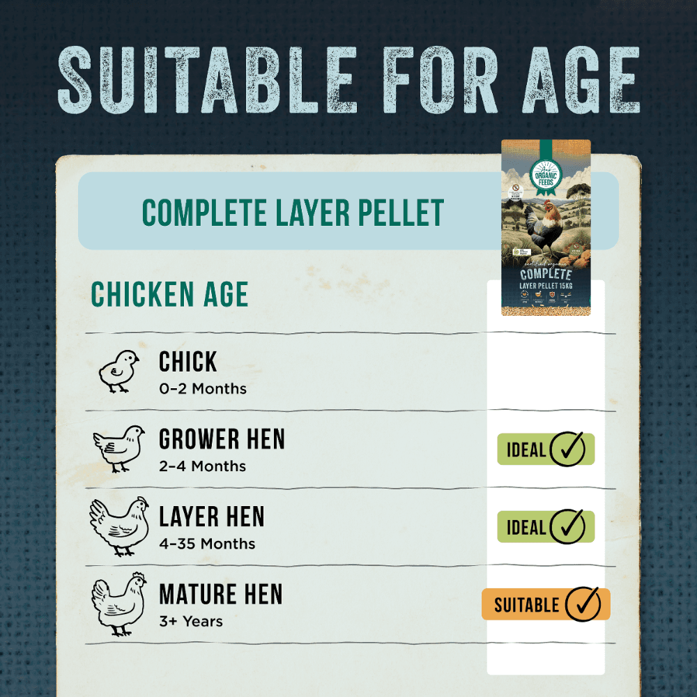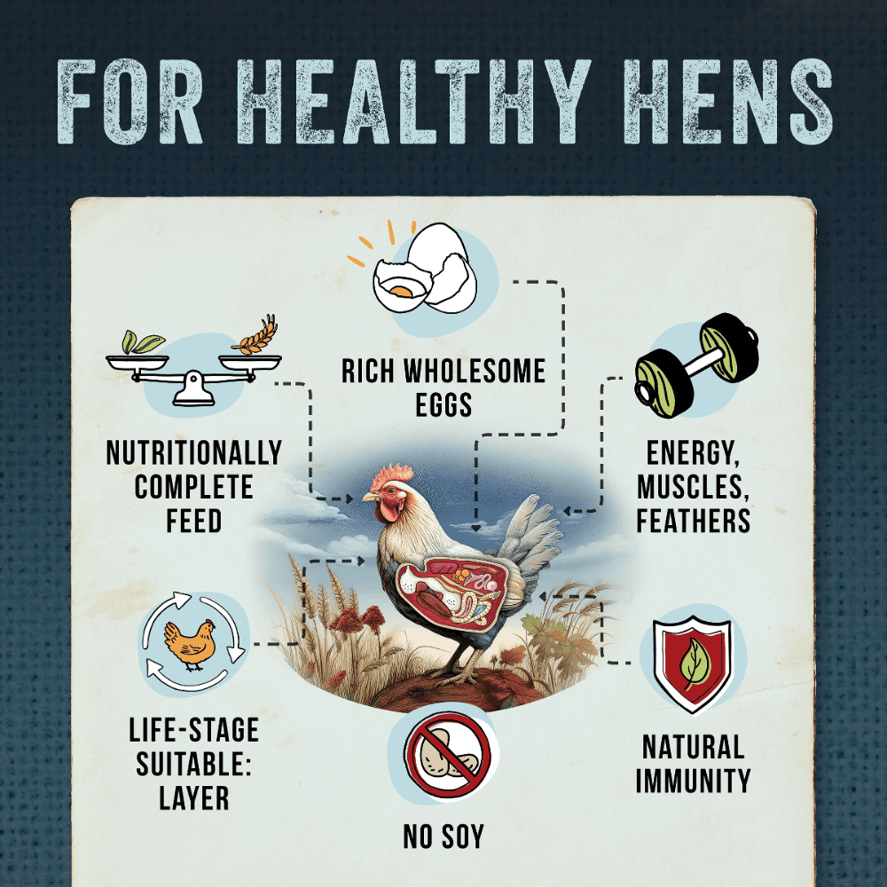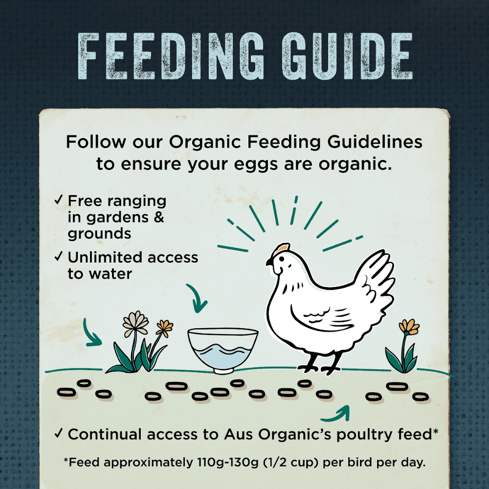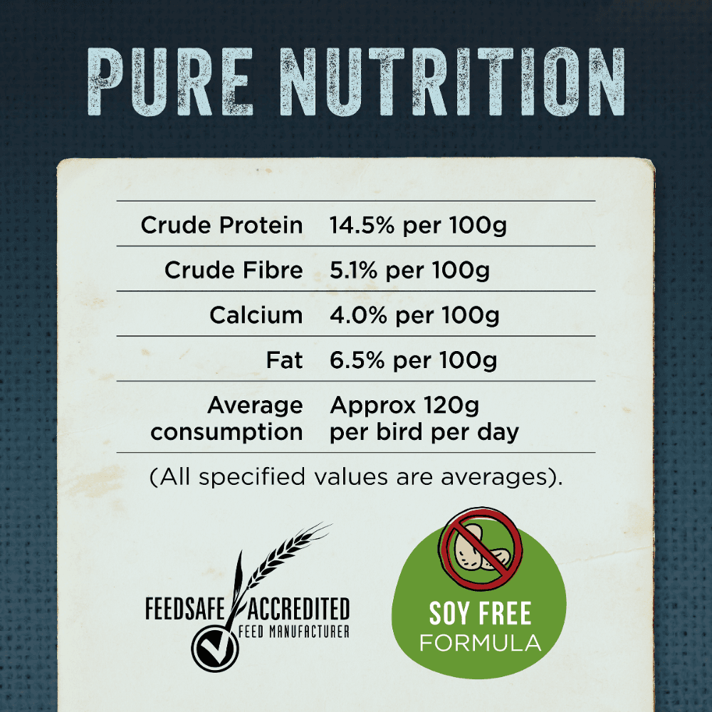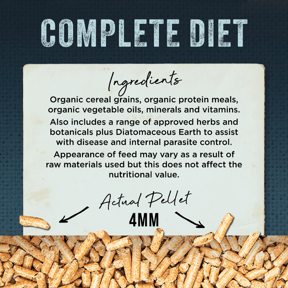 Organic Sorghum, Organic Millrun, Organic Expel Soy Meal, Limestone, Organic Mixed Post Harvest Husk/Hulls, Vitamins and Minerals, Di Calcium Phosphate, Starfix, Diatomaceous Earth