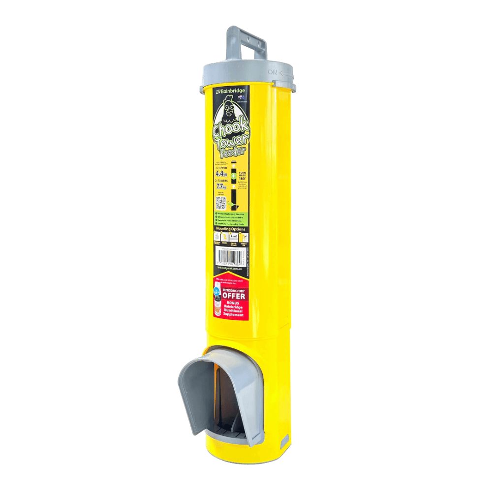 The Bainbridge Chook Tower Feeder is an Australian-made gravity feeding system designed to reduce feed waste and keep your flock's food clean and dry. Featuring a unique modular design and multiple pest-deterrent features, this feeder offers a convenient and hygienic way to keep your chickens well-fed.
