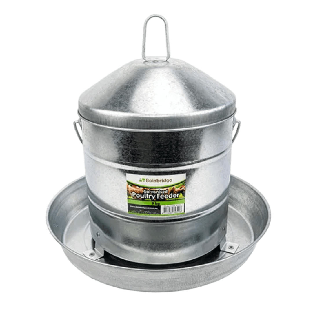 - The hanging handle and fitted rain cover keep feed clean, dry, and hygienically off the ground