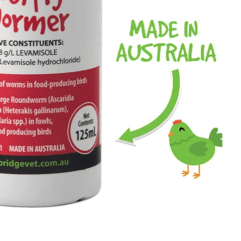 The Bainbridge Poultry Wormer is an Australian-made liquid treatment formulated to control Large Roundworm, Caecal Worm, and Hairworm in poultry. It uses the active ingredient Levamisole to effectively treat infestations in food-producing birds like fowls and turkeys.