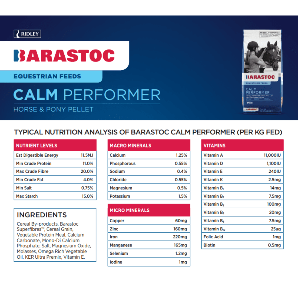 Cereal By-products, Barastoc Superfibres™, Cereal Grain, Vegetable Protein Meal, Calcium Carbonate, Mono-Di Calcium Phosphate, Salt, Magnesium Oxide, Molasses, Omega Rich Vegetable Oil, KER Ultra Premix, Vitamin E.