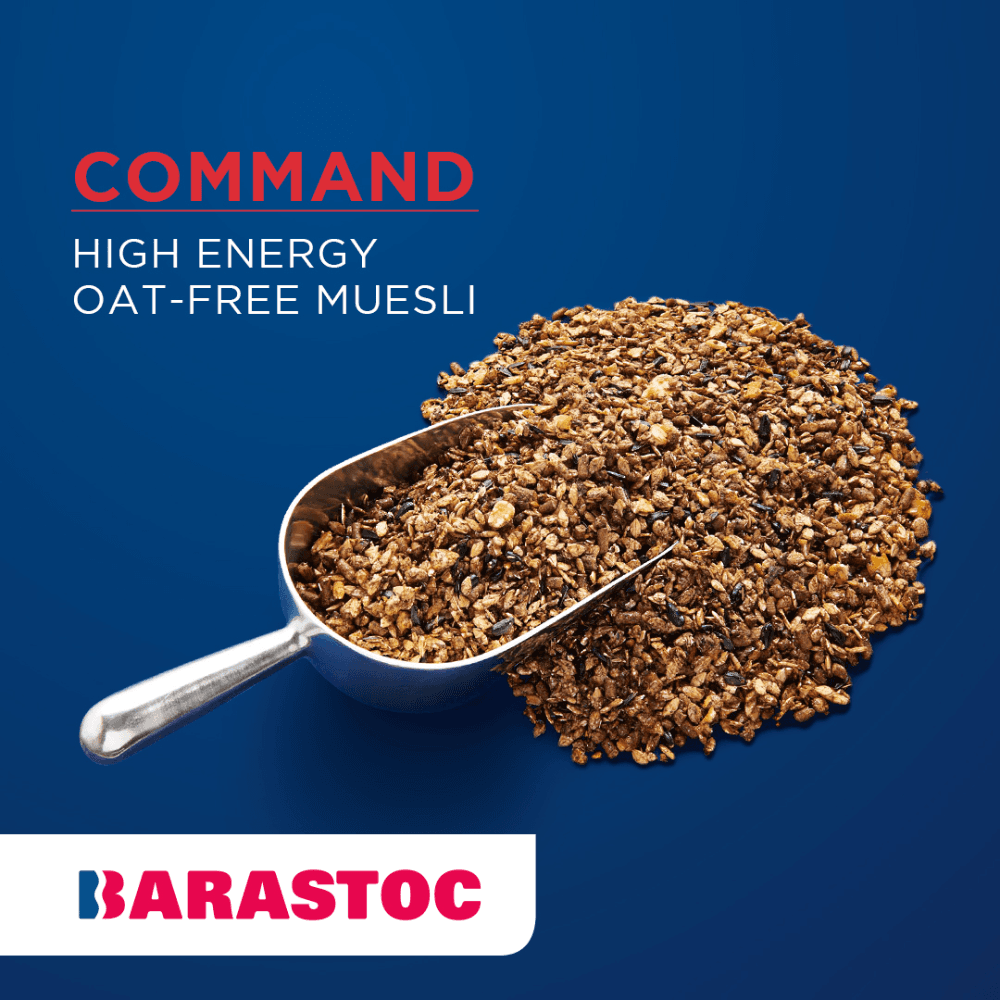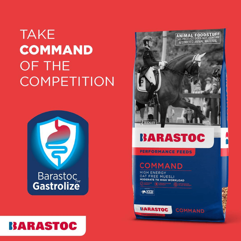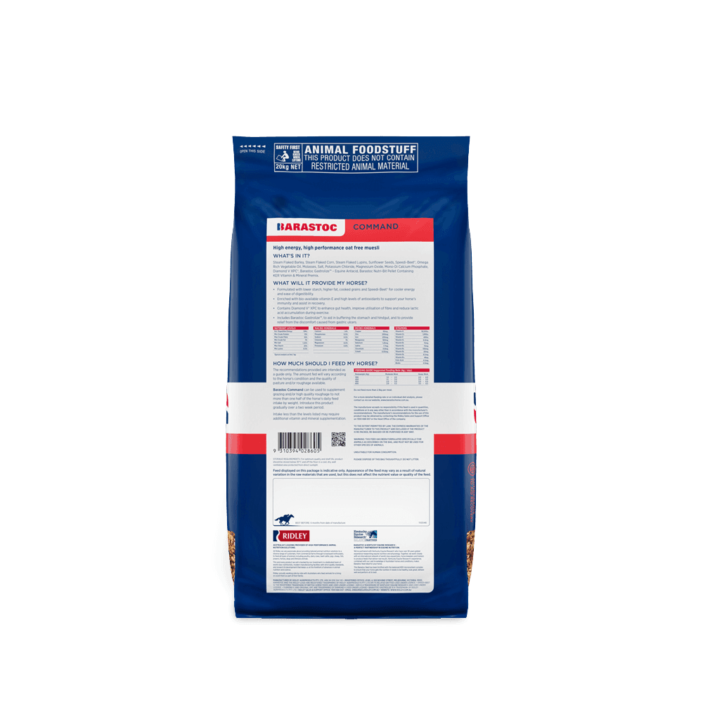 Barastoc Command is a high-energy, oat-free muesli formulated to meet the demands of performance horses requiring sustained energy without the behavioural issues often associated with high-starch feeds. Its unique blend of cooked grains, beet pulp, and added supplements supports optimal performance, digestive health, and recovery.