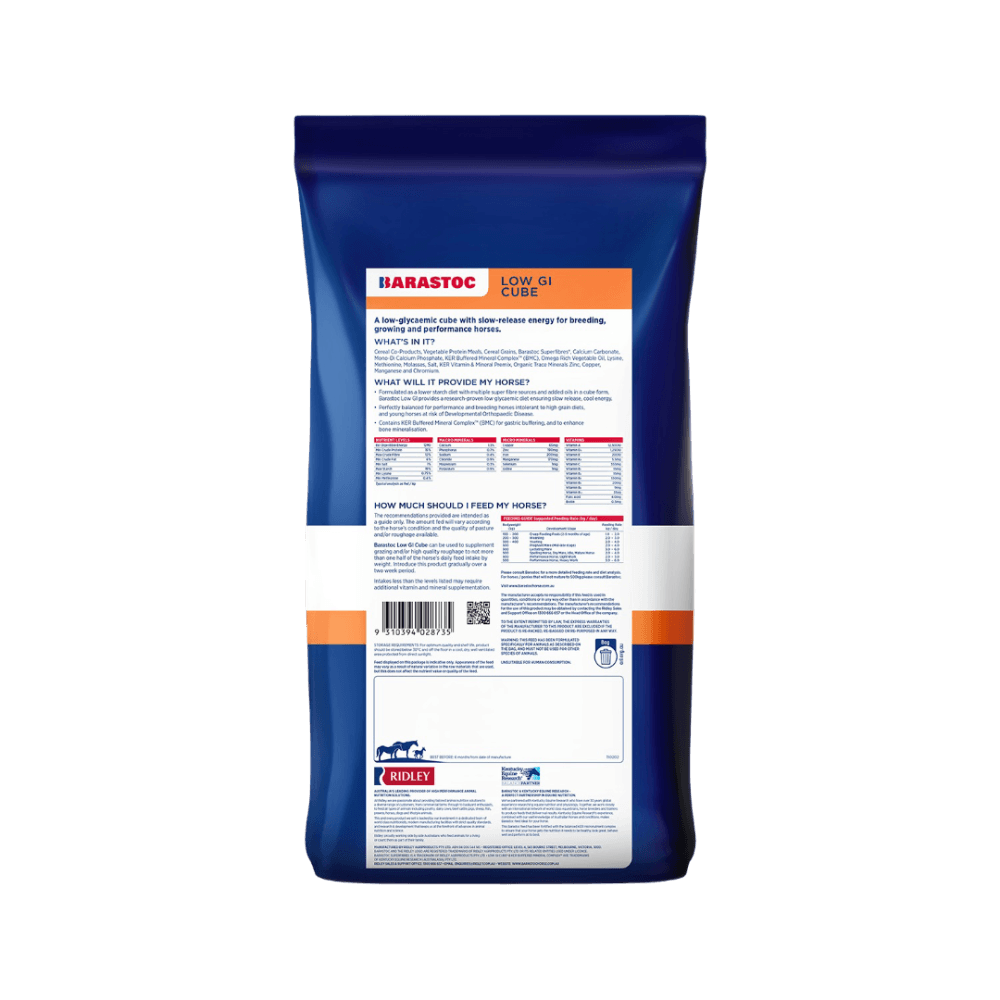 Barastoc Low GI Cube is a premium, low-glycaemic feed for growing, breeding, and performance horses. It delivers slow-release energy from super fibres and omega-rich oils, reducing starch-related risks. Fortified with KER Buffered Mineral Complex (BMC) and essential vitamins/minerals, it supports digestive health, bone development, and overall well-being, even for horses sensitive to high-grain diets.