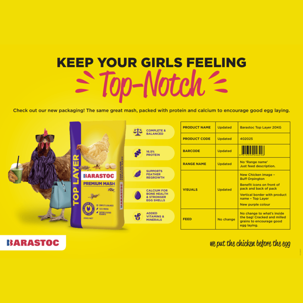 Nurture your egg-laying flock with Barastoc Top Layer, a nutritious, balanced, and complete premium mash feed. Formulated with higher levels of nutrients, it is designed to help your hens reach their laying potential, support feather regrowth after moulting, and ensure strong, healthy eggs.