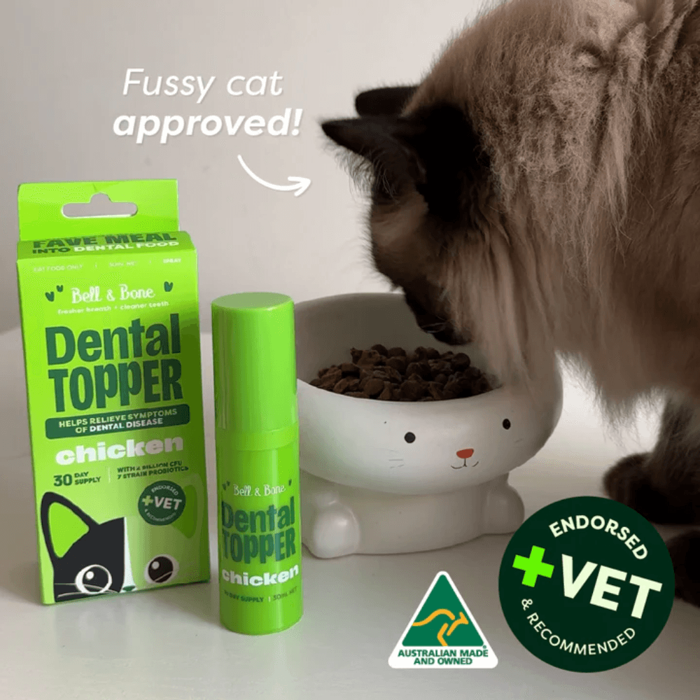 Bell & Bone Dental Topper for Cats - Chicken Flavour supports dental health from the inside out by promoting gut health, which plays a key role in reducing plaque and improving oral hygiene. Simply shake well and spray directly onto your cat's food once daily to help freshen breath, support digestion, and boost overall wellbeing with natural, protein-rich ingredients.