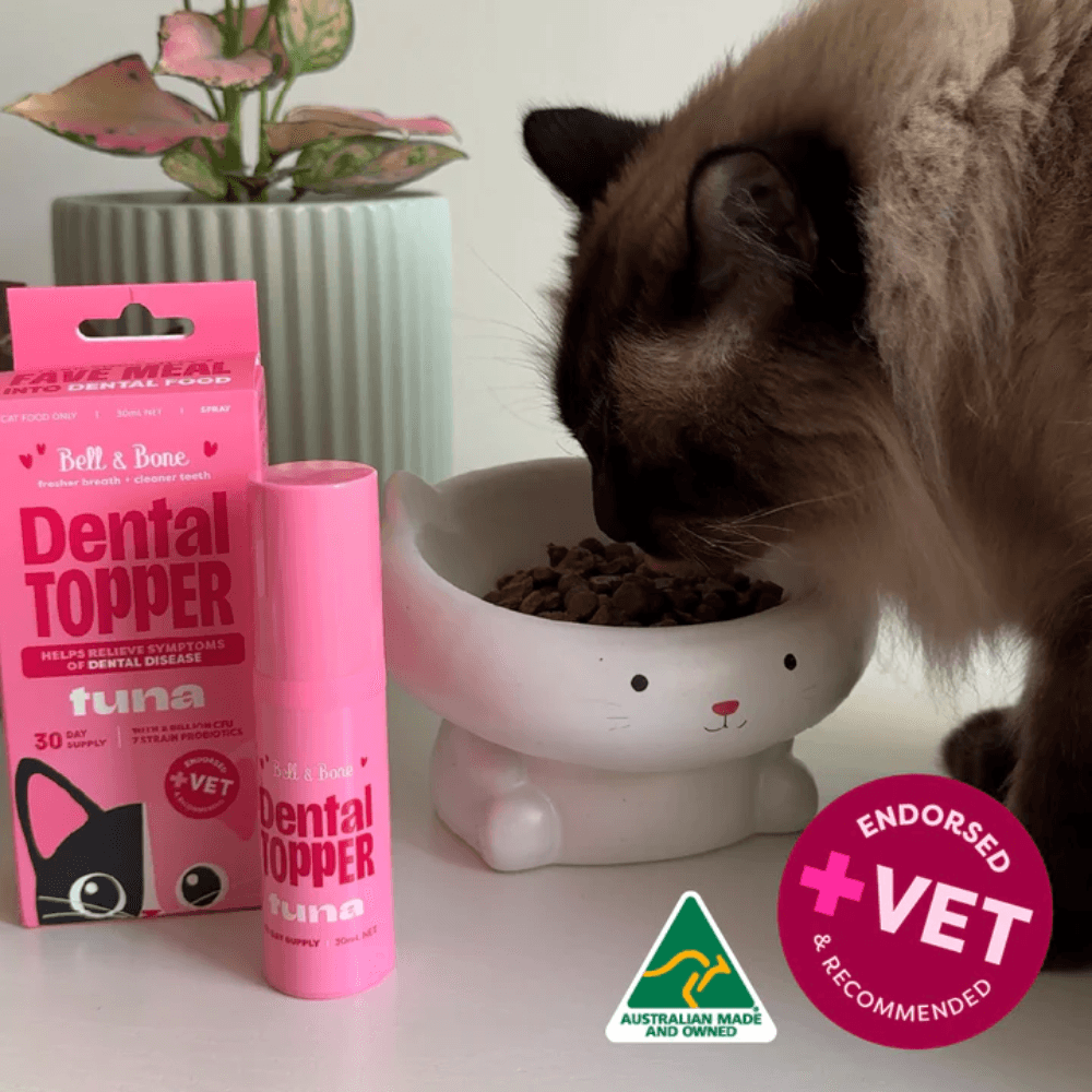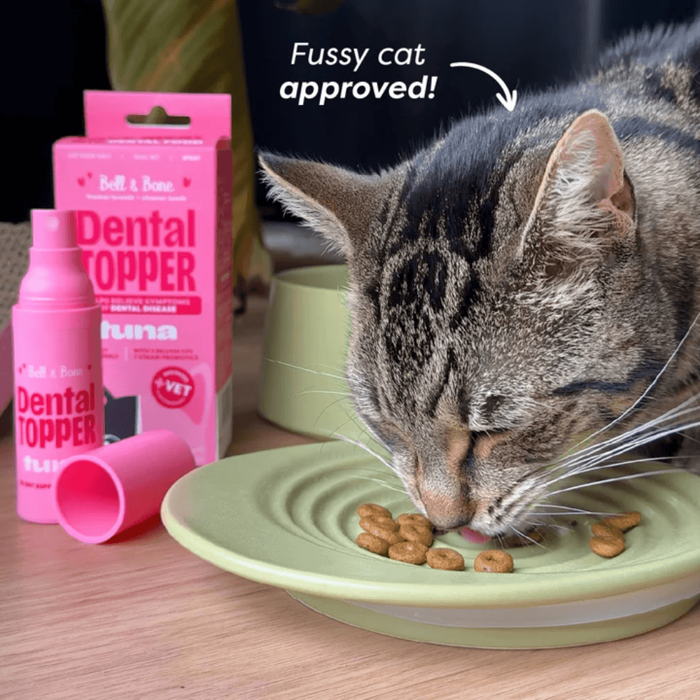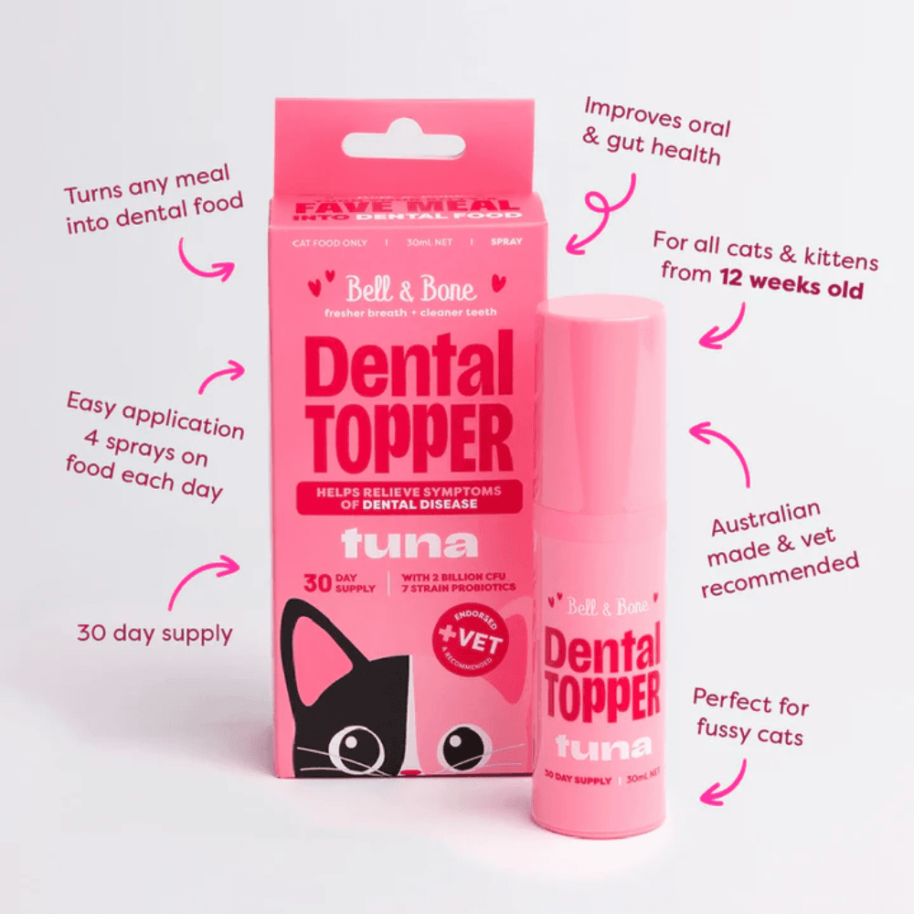 Bell & Bone Dental Topper Spray for Cats - Tuna Flavour supports your cat's dental health by targeting the root cause- gut imbalance. This low-fat, tasty spray combines oral actives with a unique tribiotic blend (prebiotics, probiotics, and postbiotics) to help reduce plaque, improve breath, and promote overall wellbeing with just 4 sprays on any meal daily.