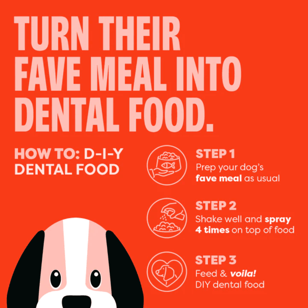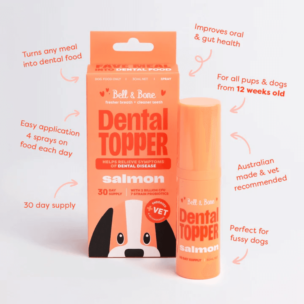Bell & Bone Dental Topper Spray for Dogs - Salmon Flavour supports your dog's dental health by targeting bad bacteria in the gut, the root cause of plaque and bad breath. With just 4 sprays a day on any meal, this tasty spray combines oral actives and a powerful tribiotic blend to promote fresher breath and healthier teeth no brushing required.