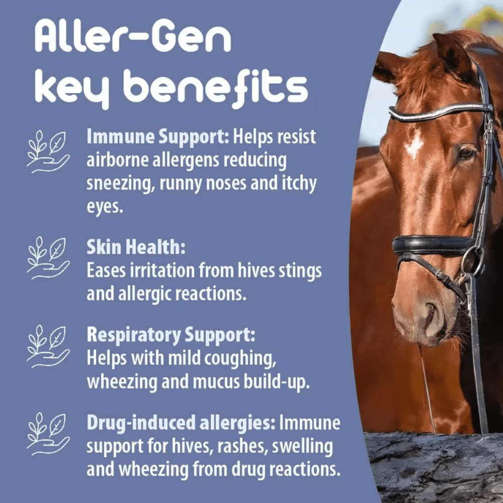 Aller-Gen is a professional herbal blend designed to support respiratory and skin health in horses exposed to environmental allergens. It promotes healthy immune function and normal skin responses, helping horses maintain comfort and resilience during seasonal challenges, dust exposure, and pasture sensitivities
