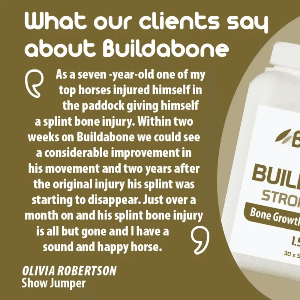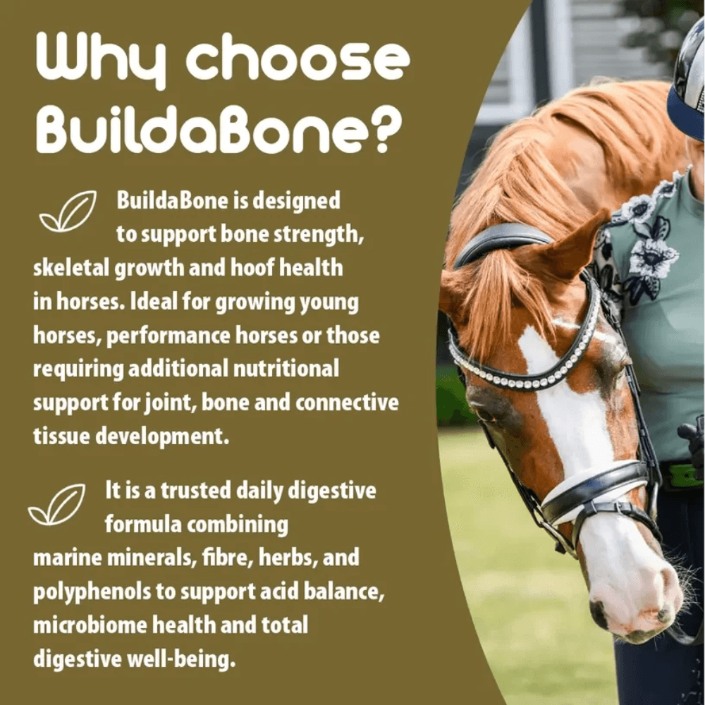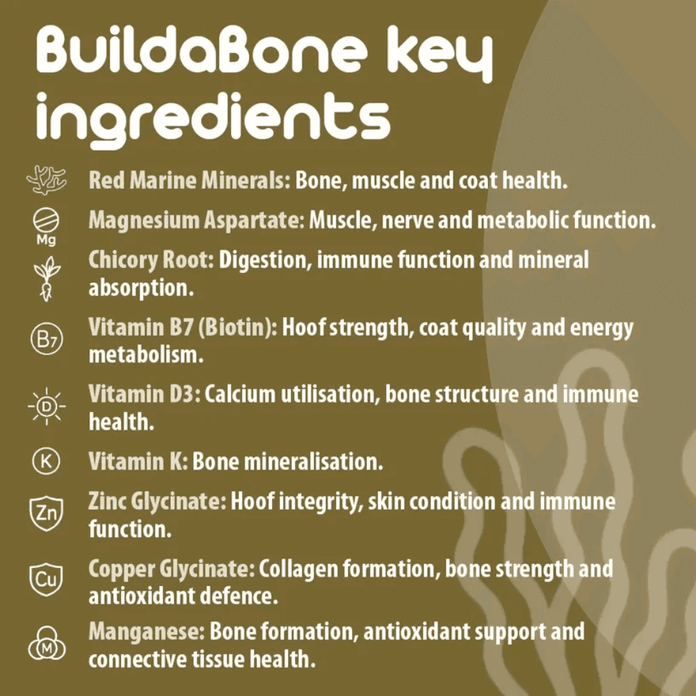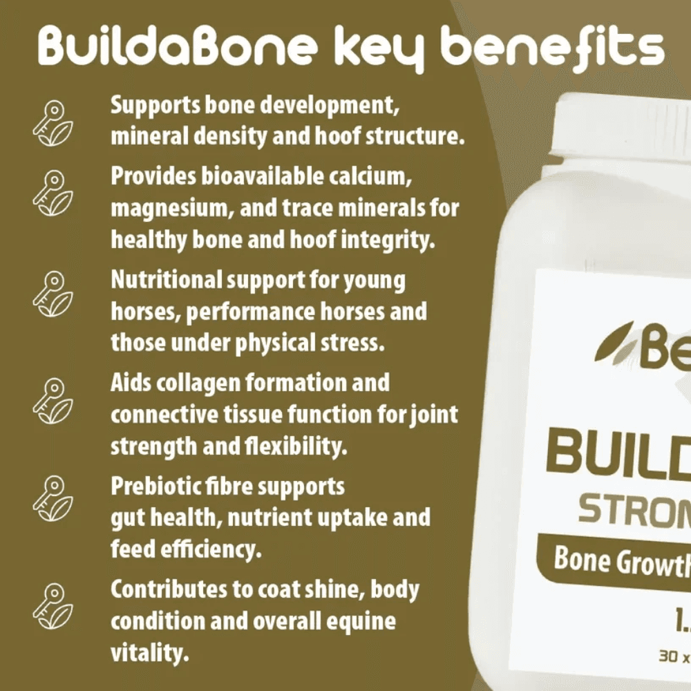 BetaVet Buildabone is a professional equine supplement supporting bone strength, skeletal growth, and hoof health. Ideal for growing young horses, performance horses, or those needing joint/bone/connective tissue support