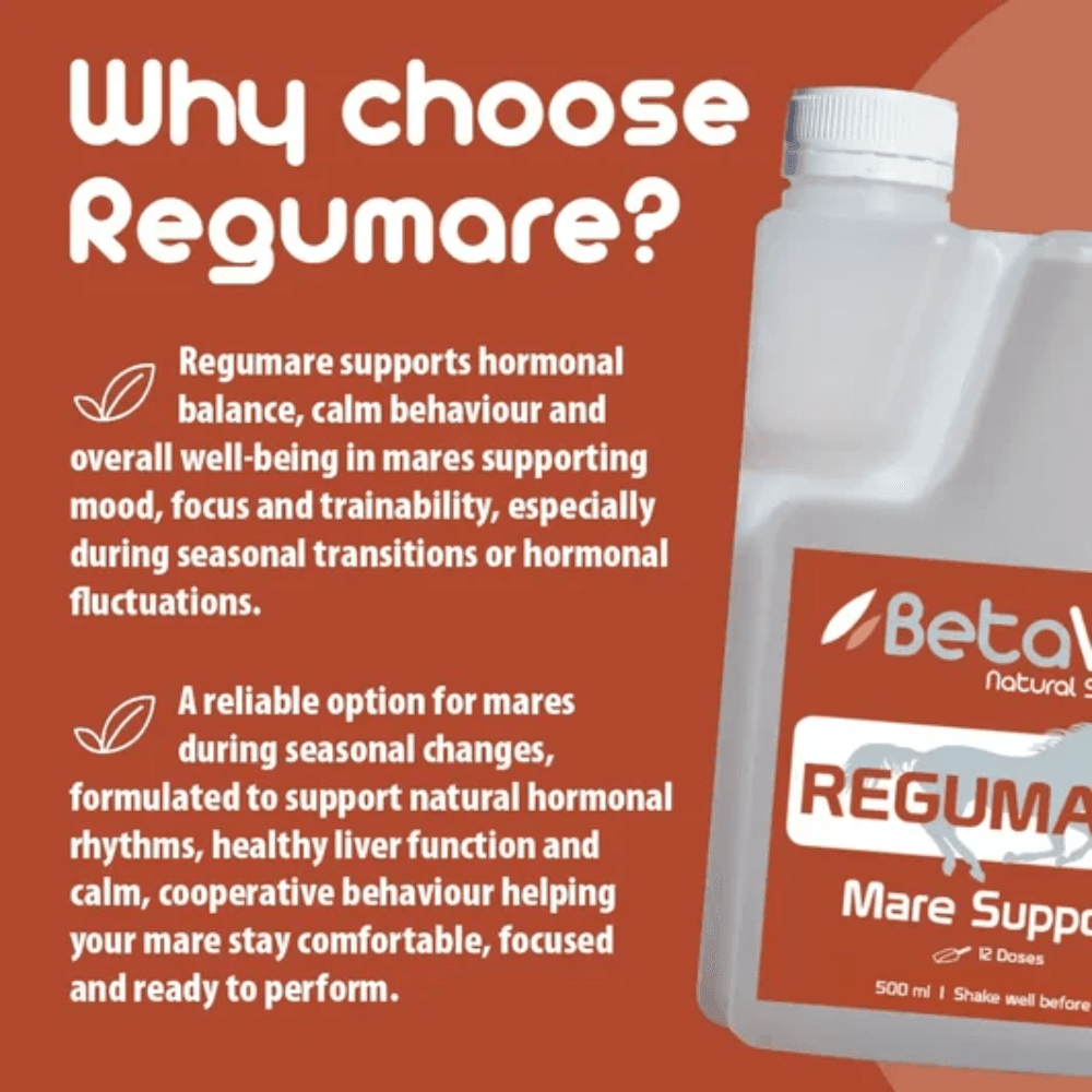 BetaVet Regumare is a professional herbal blend supporting hormonal balance, calm behaviour, and overall well-being in mares. This formula targets endocrine, liver, and nervous system function, aiding mood, focus, and trainability during seasonal/hormonal fluctuations.