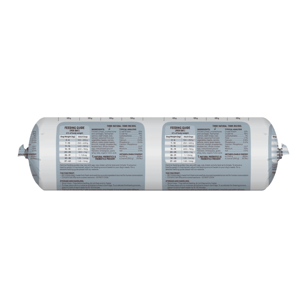 The Big Dog Active Frozen Roll Raw Dog Food is a high-energy, multi-protein raw meal specifically formulated to support the nutritional needs of active and working dogs. This 2kg roll combines RSPCA-approved chicken, Australian beef, and Tasmanian salmon in an economical format ideal for larger breeds or multi-dog households.