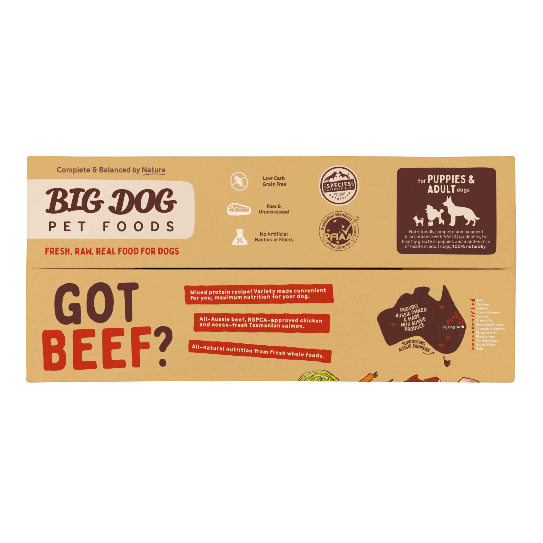 Beef (meat, washed tripe, crushed bone & cartilage, liver, kidney, spleen), chicken (meat, crushed bone & cartilage), Tasmanian salmon, apple, green bananas, carrots, lettuce, green beans, sprouted wheatgrass, orange, strawberries, blueberries, whole chicken eggs, psyllium, goats whey, kelp, organic fulvic acid