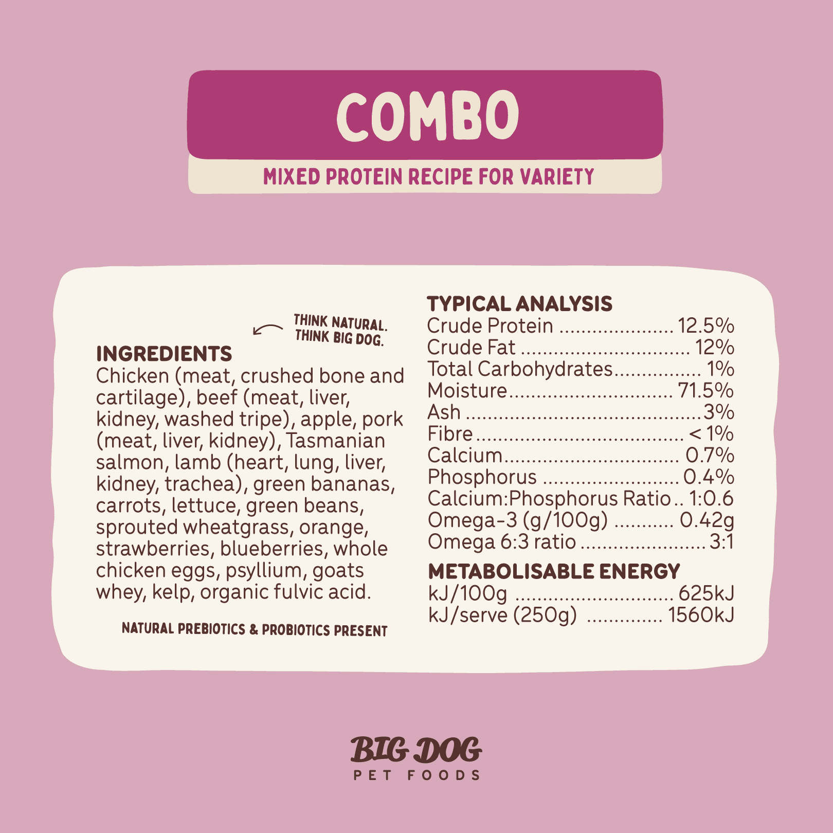 Chicken (meat, crushed bone & cartilage), beef (meat, liver, kidney, washed tripe), apple, pork (meat, liver, kidney), Tasmanian salmon, lamb (heart, lung, liver, kidney, trachea), green bananas, carrots, lettuce, green beans, sprouted wheatgrass, orange, strawberries, blueberries, whole chicken eggs, psyllium, goats whey, kelp, organic fulvic acid