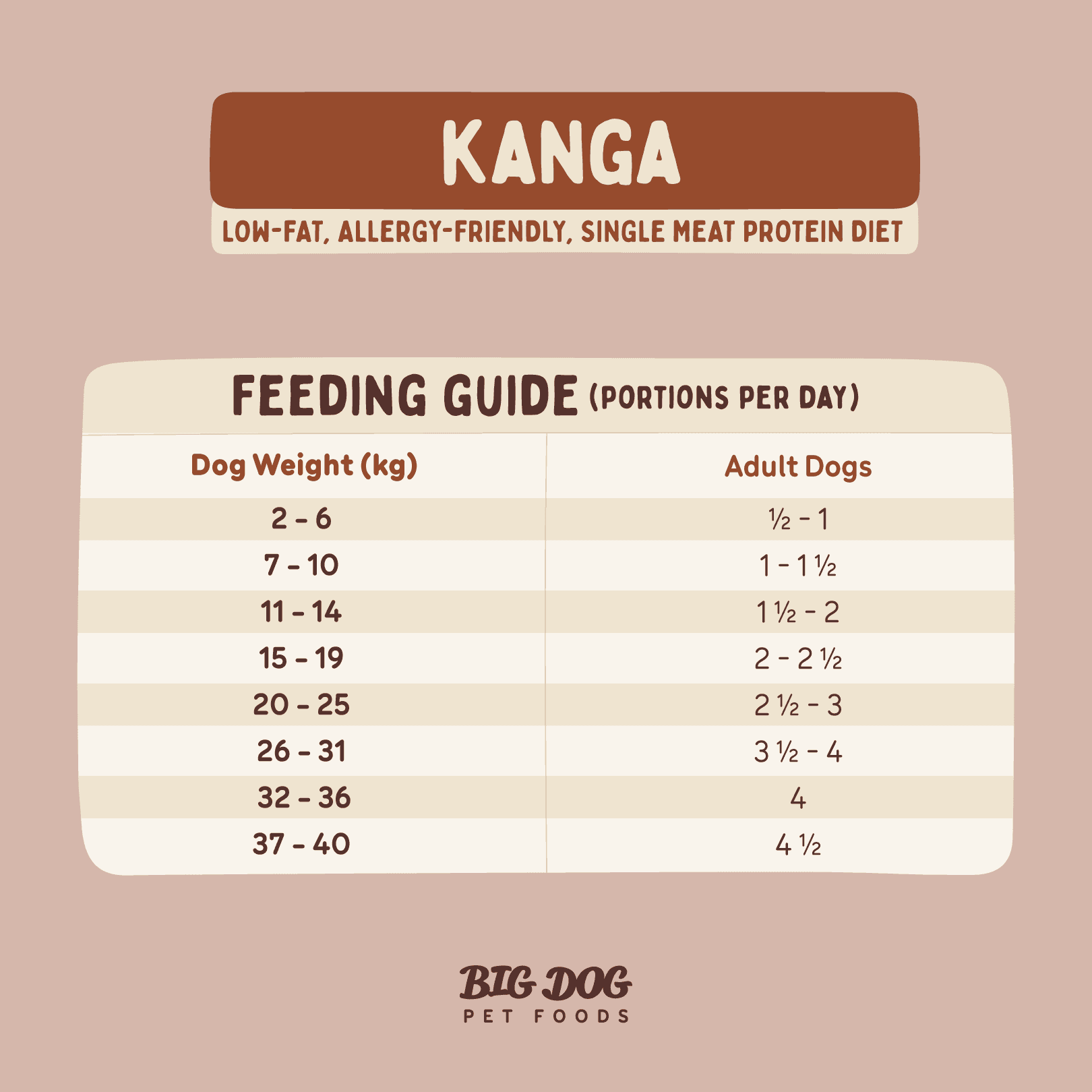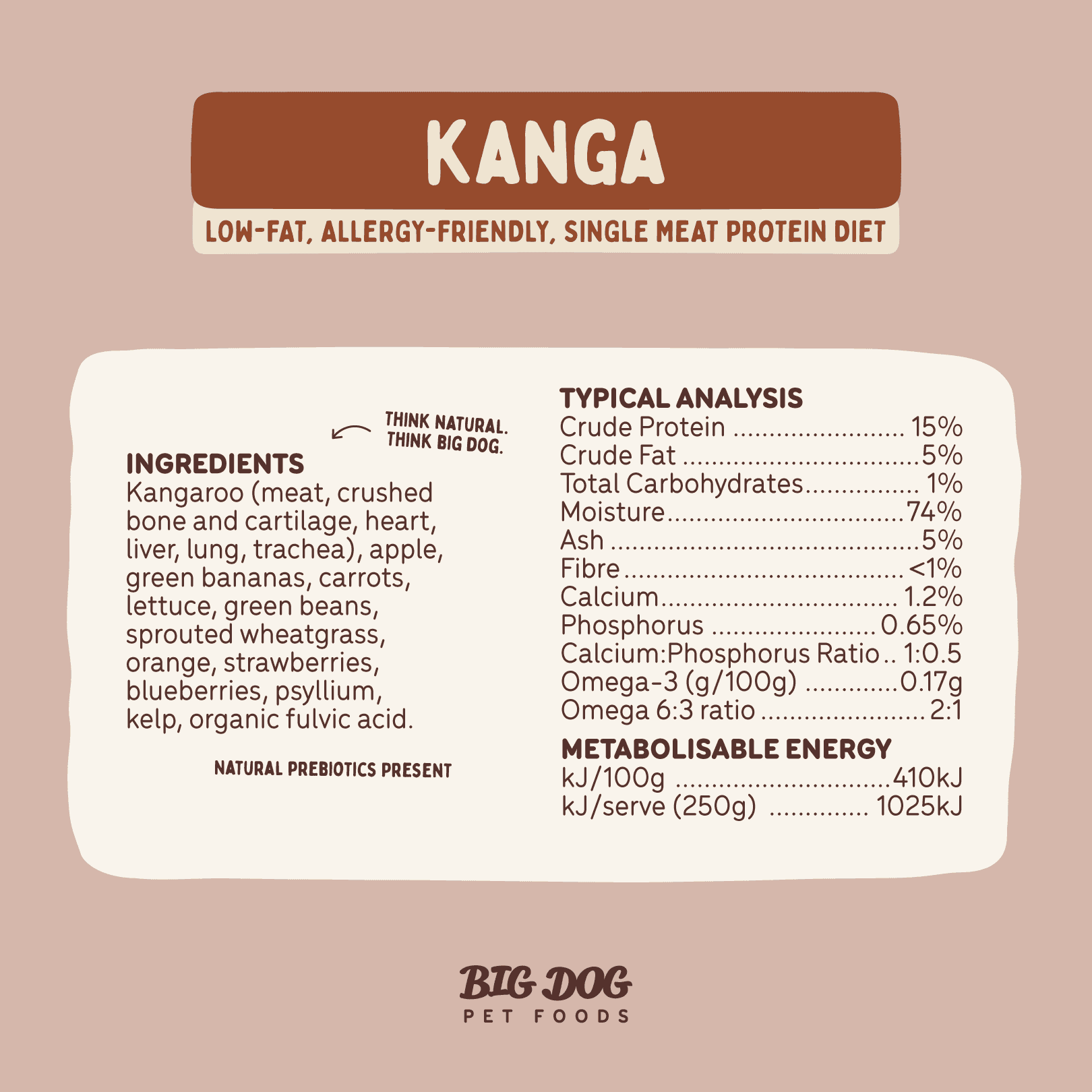 Kangaroo (meat, crushed bone & cartilage, heart, liver, lung, trachea), apple, green bananas, carrots, lettuce, green beans, sprouted wheatgrass, orange, strawberries, blueberries, psyllium, kelp, organic fulvic acid