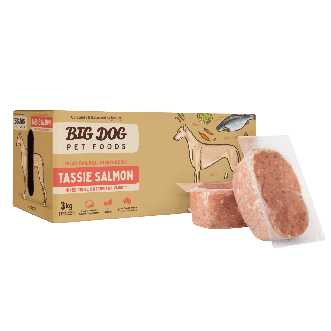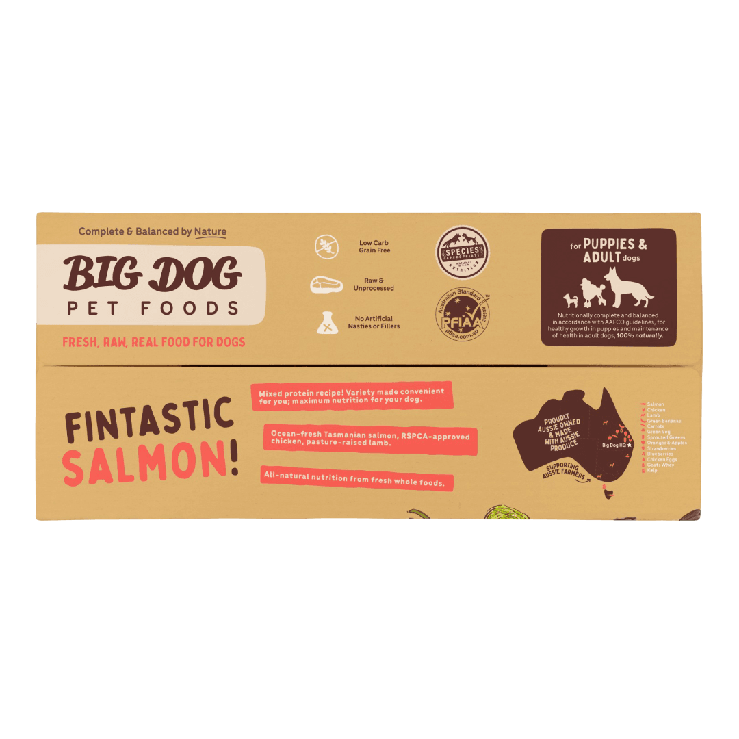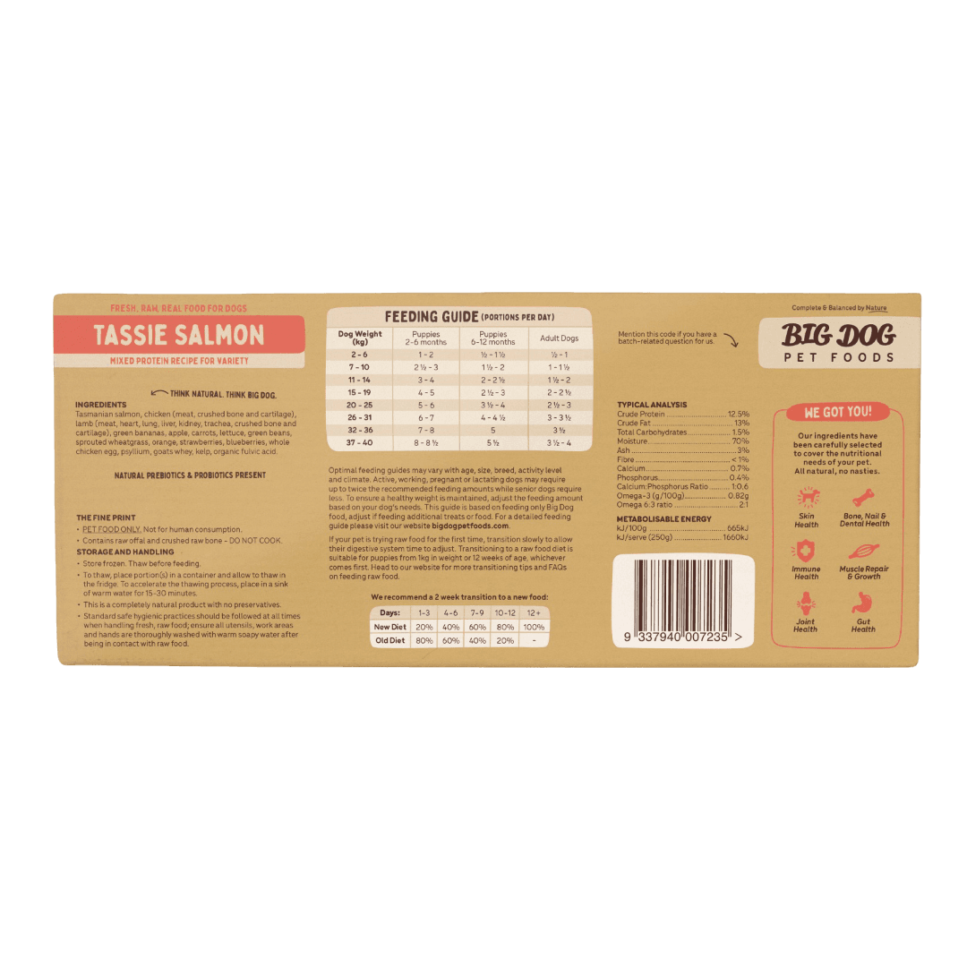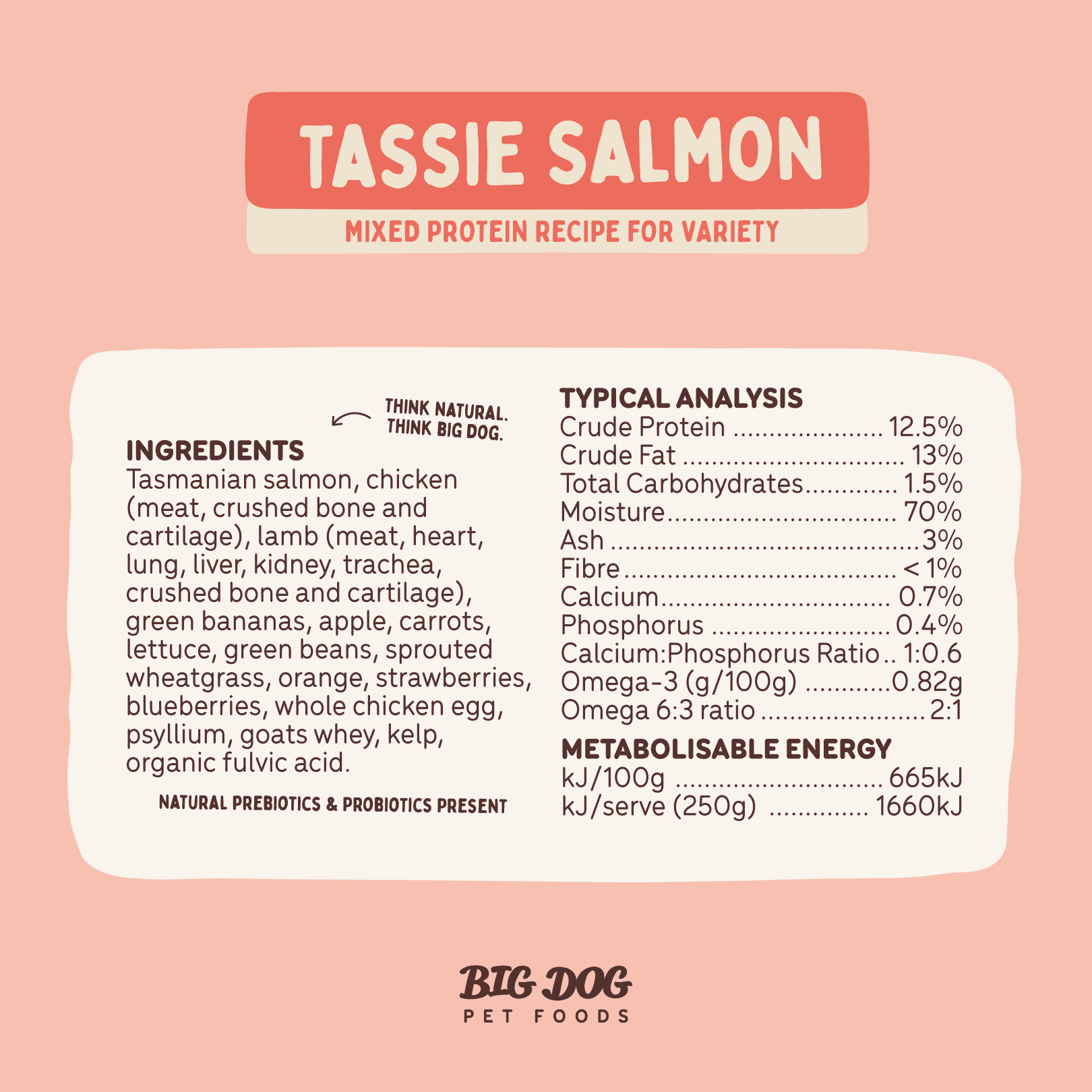 Tasmanian salmon, chicken (meat, crushed bone & cartilage), lamb (meat, heart, lung, liver, kidney, trachea, crushed bone & cartilage), green bananas, apple, carrots, lettuce, green beans, sprouted wheatgrass, orange, strawberries, blueberries, whole chicken egg, psyllium, goats whey, kelp, organic fulvic acid