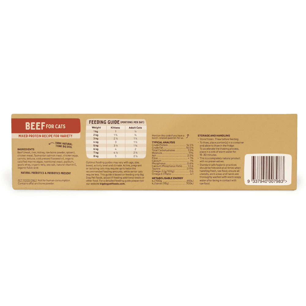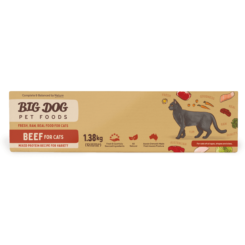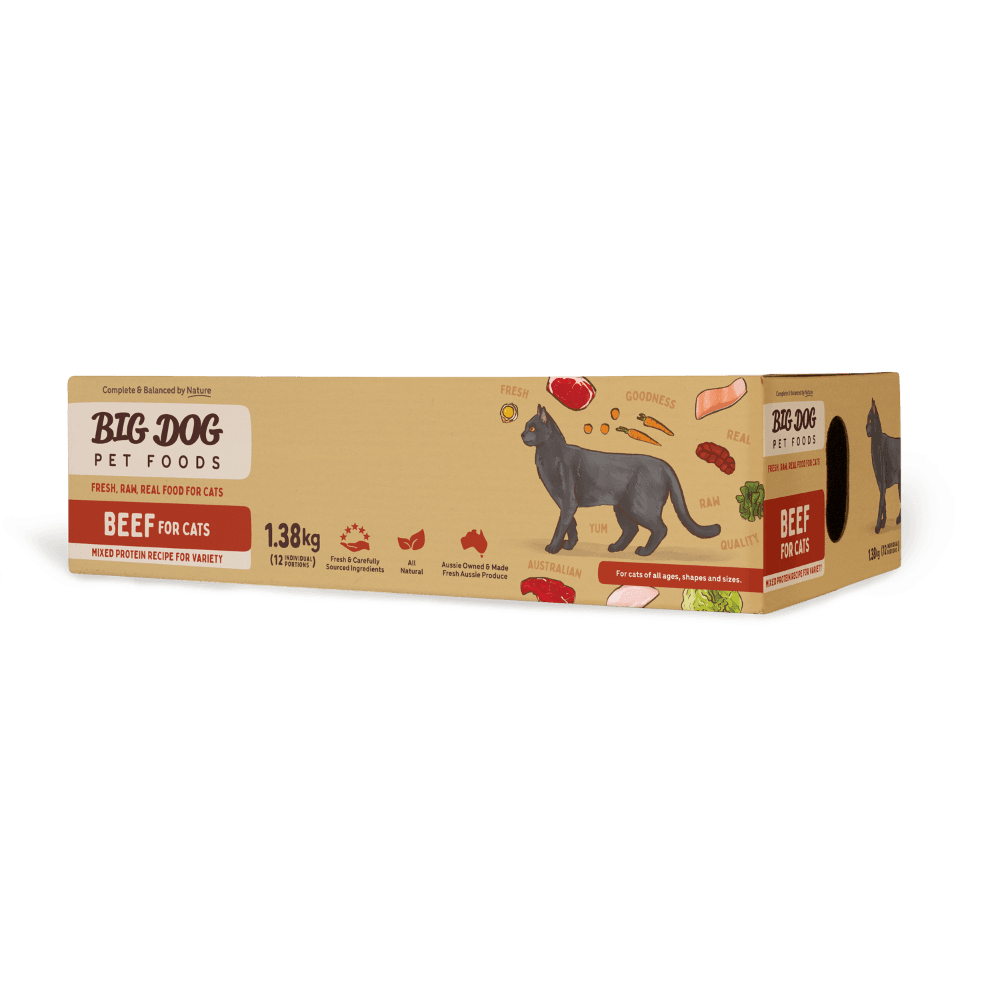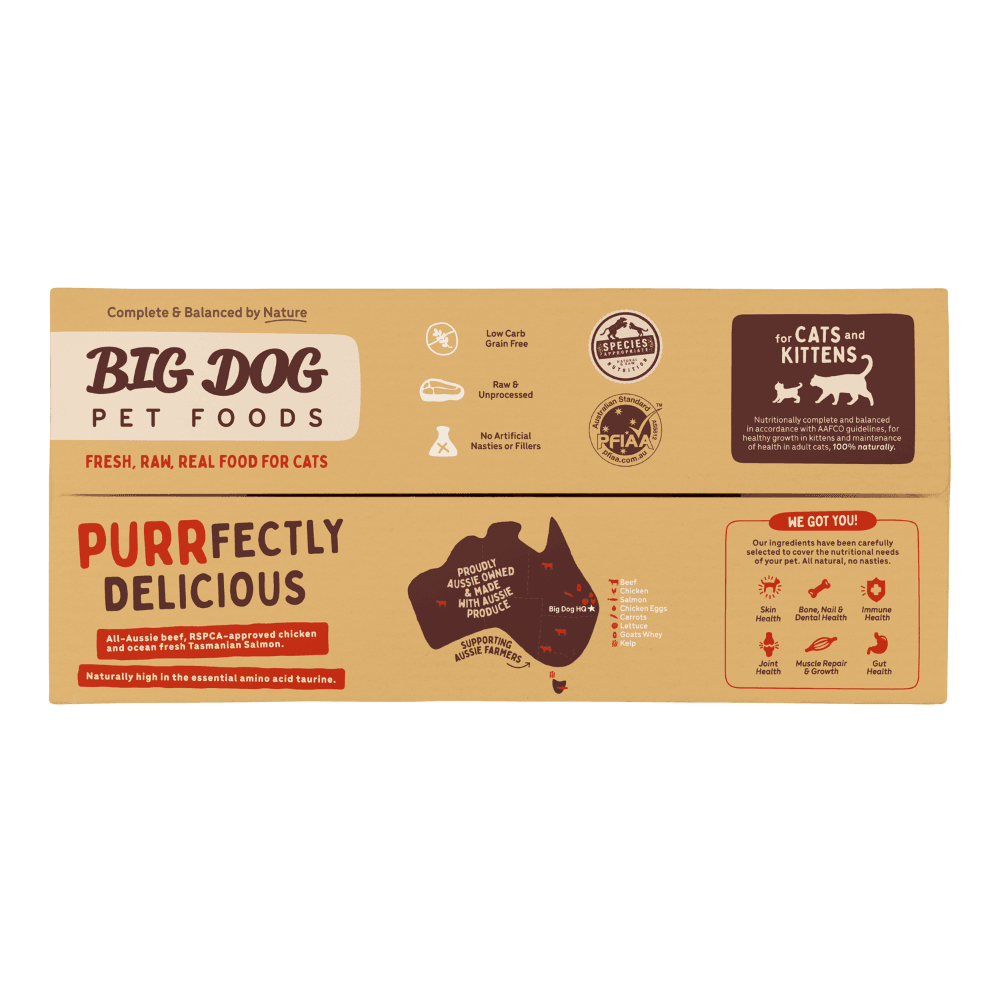 The Big Dog Beef Frozen Raw Cat Food is a complete and balanced, multi-protein raw meal formulated for the nutritional needs of cats. This recipe features all-Australian beef as the primary protein, blended with RSPCA-approved chicken and Tasmanian salmon for a varied, biologically appropriate diet.