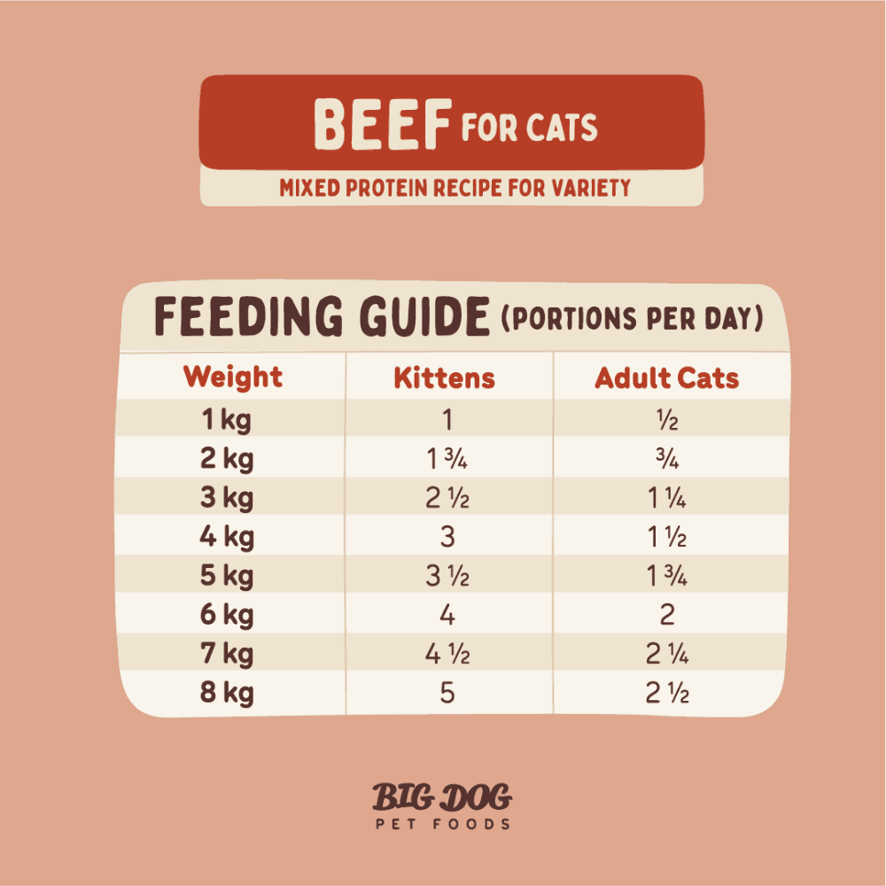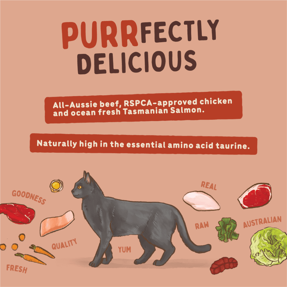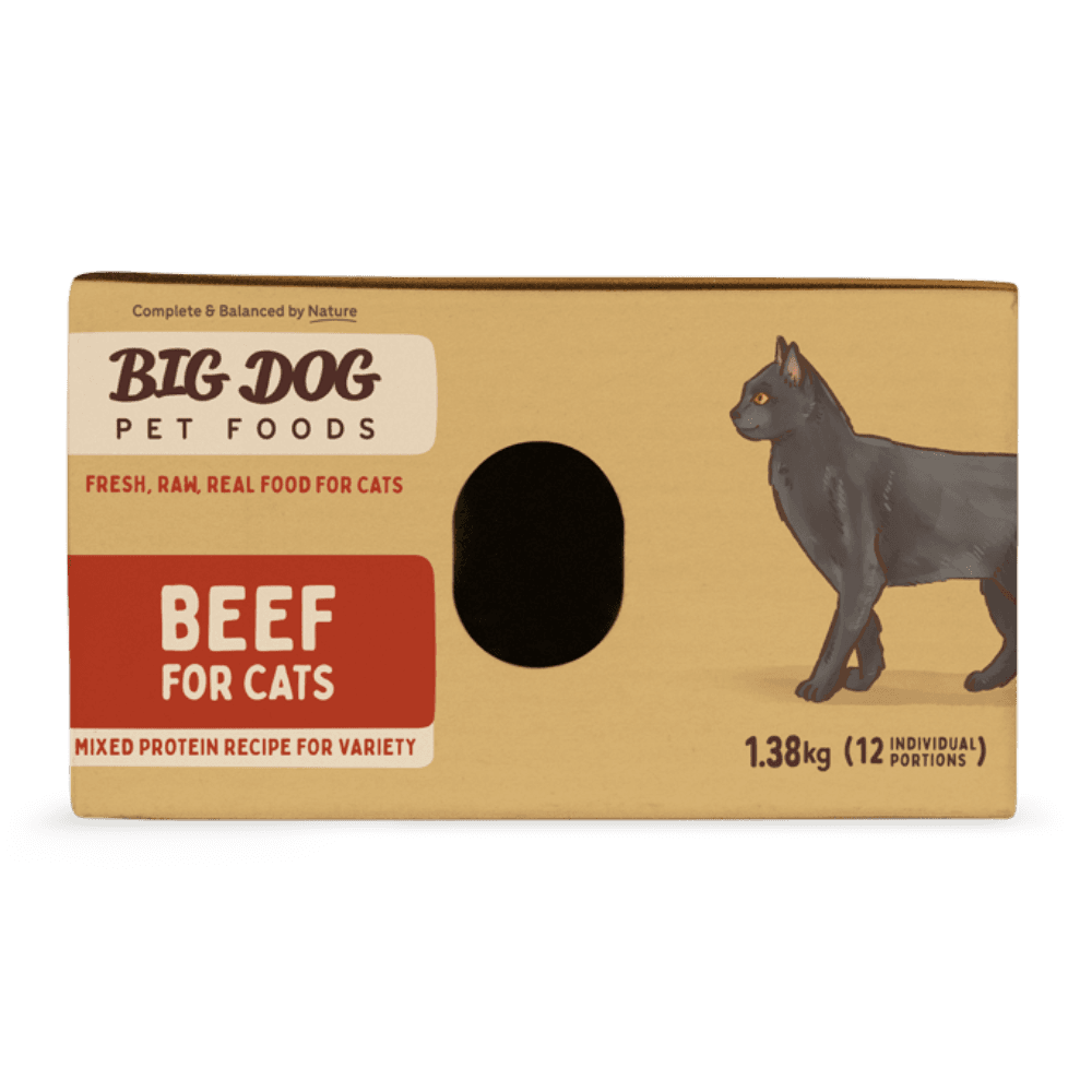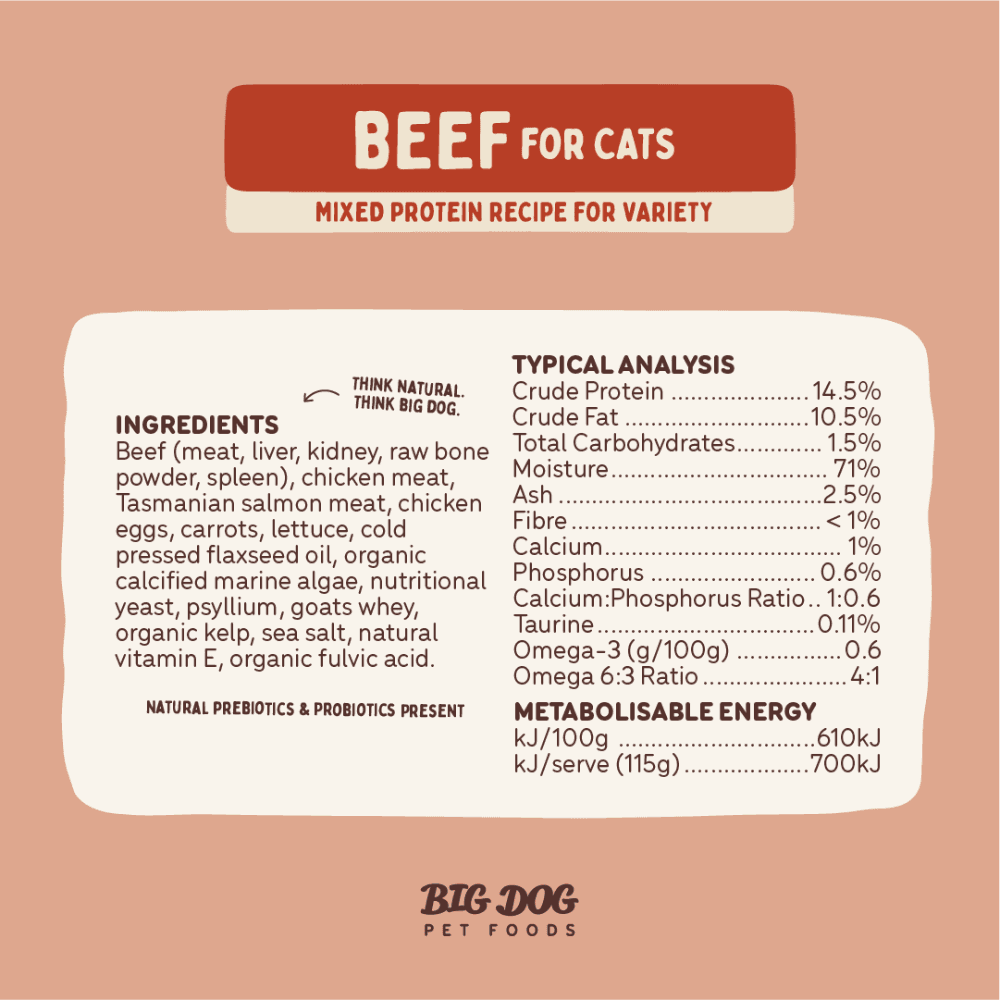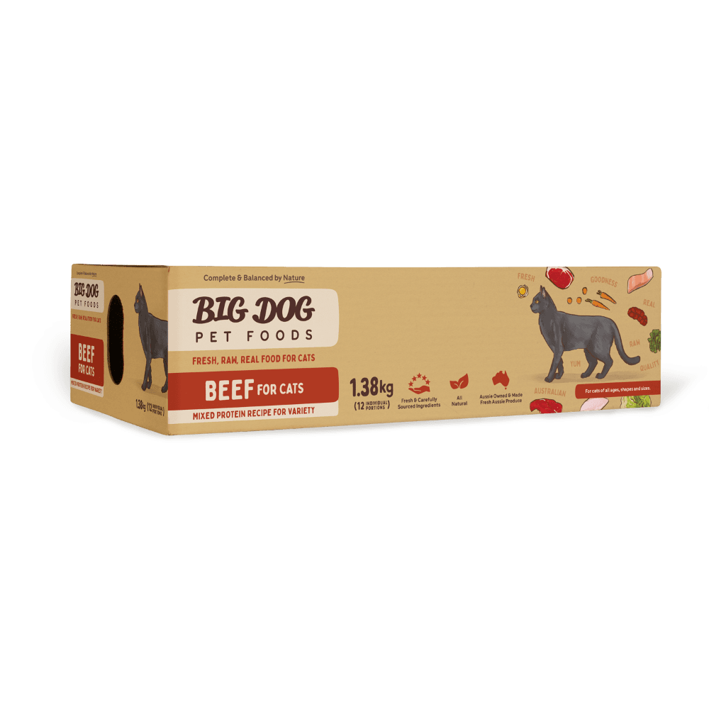 The Big Dog Beef Frozen Raw Cat Food is a complete and balanced, multi-protein raw meal formulated for the nutritional needs of cats. This recipe features all-Australian beef as the primary protein, blended with RSPCA-approved chicken and Tasmanian salmon for a varied, biologically appropriate diet.