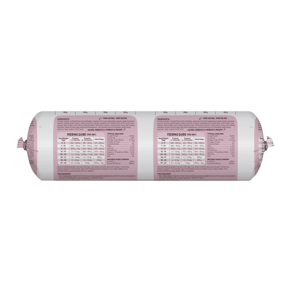 The Big Dog Combo Frozen Roll Raw Dog Food is a multi-protein, biologically appropriate meal packed in an economical roll format. It combines high-quality Australian beef, pasture-raised lamb, RSPCA-approved chicken, fresh pork, and Tasmanian salmon for a nutrient-dense and varied diet.