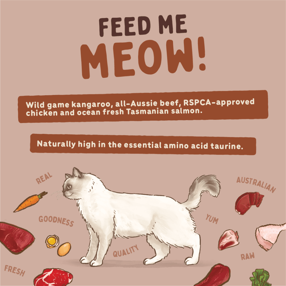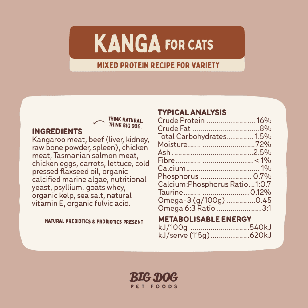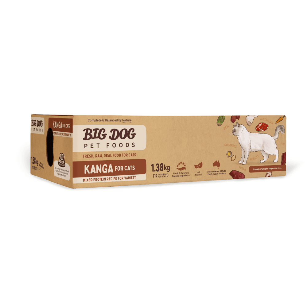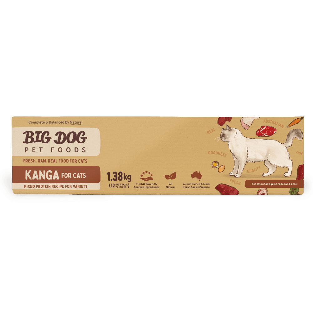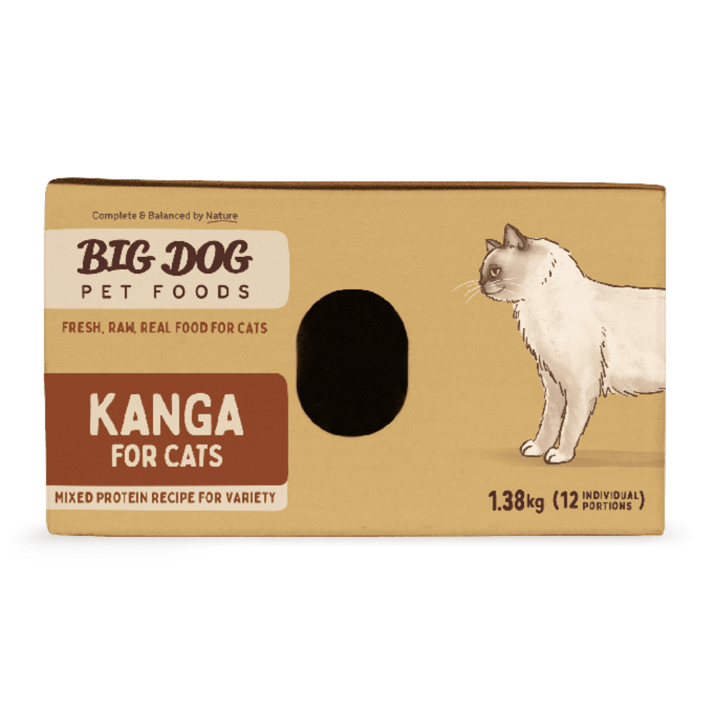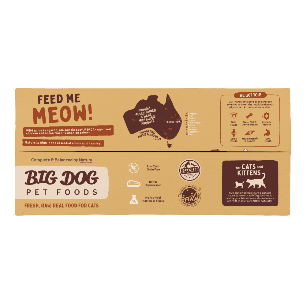 The Big Dog Kanga Frozen Raw Cat Food is a complete and balanced, multi-protein raw meal designed for the nutritional needs of cats. This recipe features lean, wild-game kangaroo blended with Australian beef, RSPCA-approved chicken, and Tasmanian salmon for a varied and biologically appropriate diet.