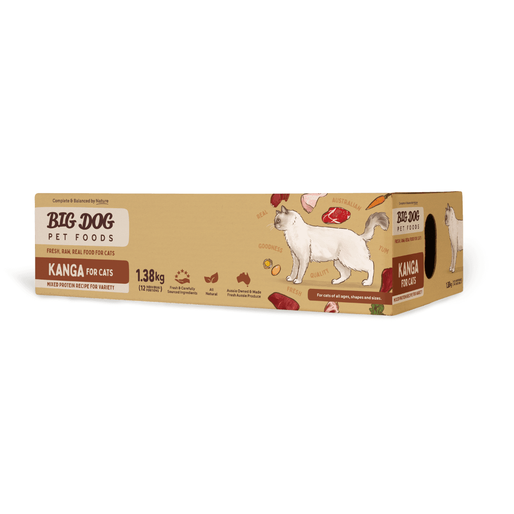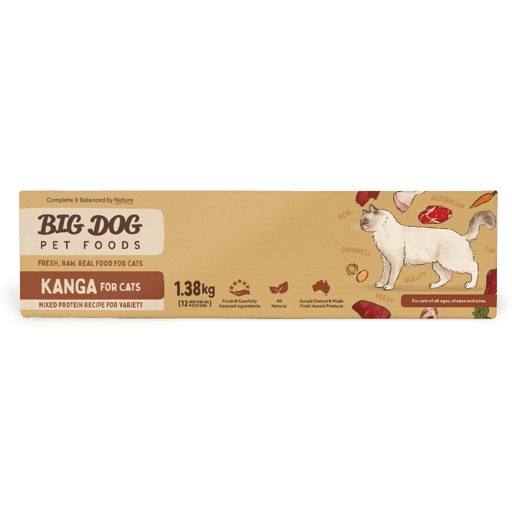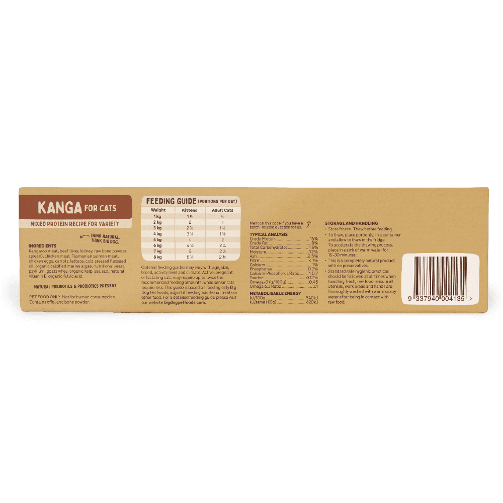 Kangaroo meat, beef (liver, kidney, raw bone powder, spleen), chicken meat, Tasmanian salmon meat, chicken eggs, carrots, lettuce, cold pressed flaxseed oil, organic calcified marine algae, nutritional yeast, psyllium, goats whey, organic kelp, sea salt, natural vitamin E, organic fulvic acid.