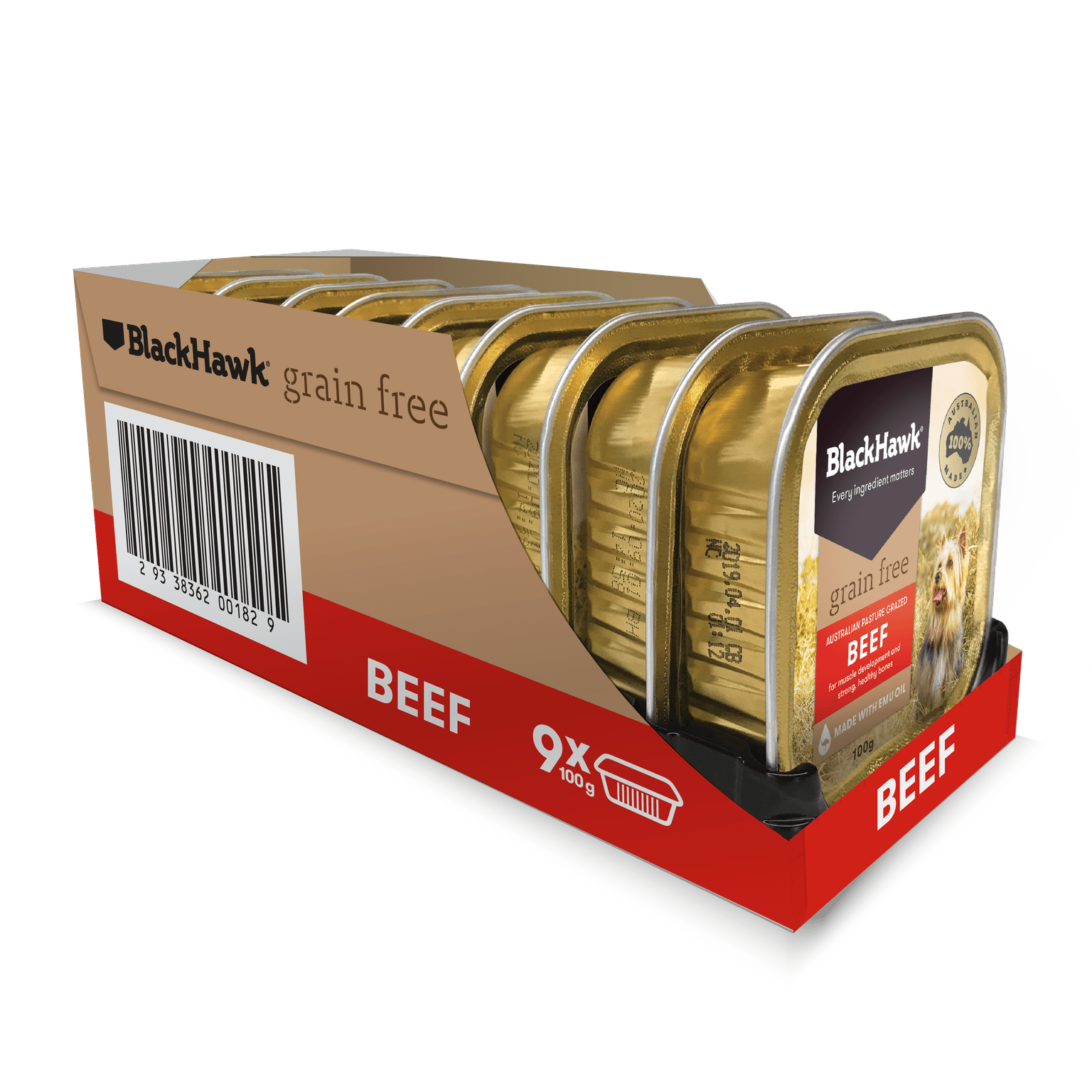 Beef, Chicken, Carrots, Potato, Gelling Agents, Flavours, Vitamins And Minerals (Choline Chloride, Vitamin E, Pantothenic Acid, Vitamin B1, Vitamin B2, Vitamin B6, Biotin, Vitamin D3, Folic Acid, Vitamin B12, Sodium Tripolyphosphate, Sodium Chloride, Calcium Carbonate, Potassium Chloride, Zinc Sulphate, Magnesium Oxide, Calcium Iodate, Sodium Selenite), Natural Colour, Oils Including Emu Oil.