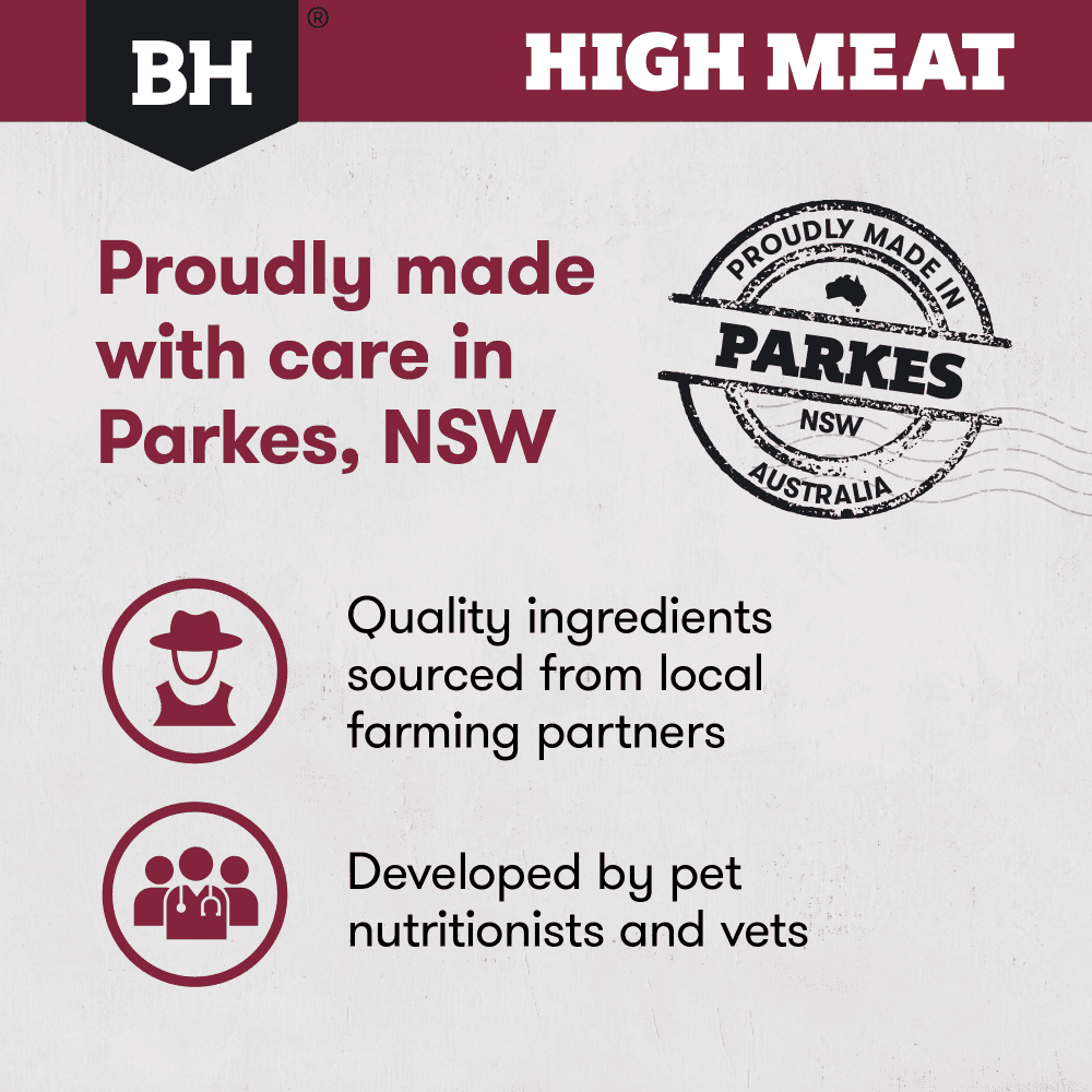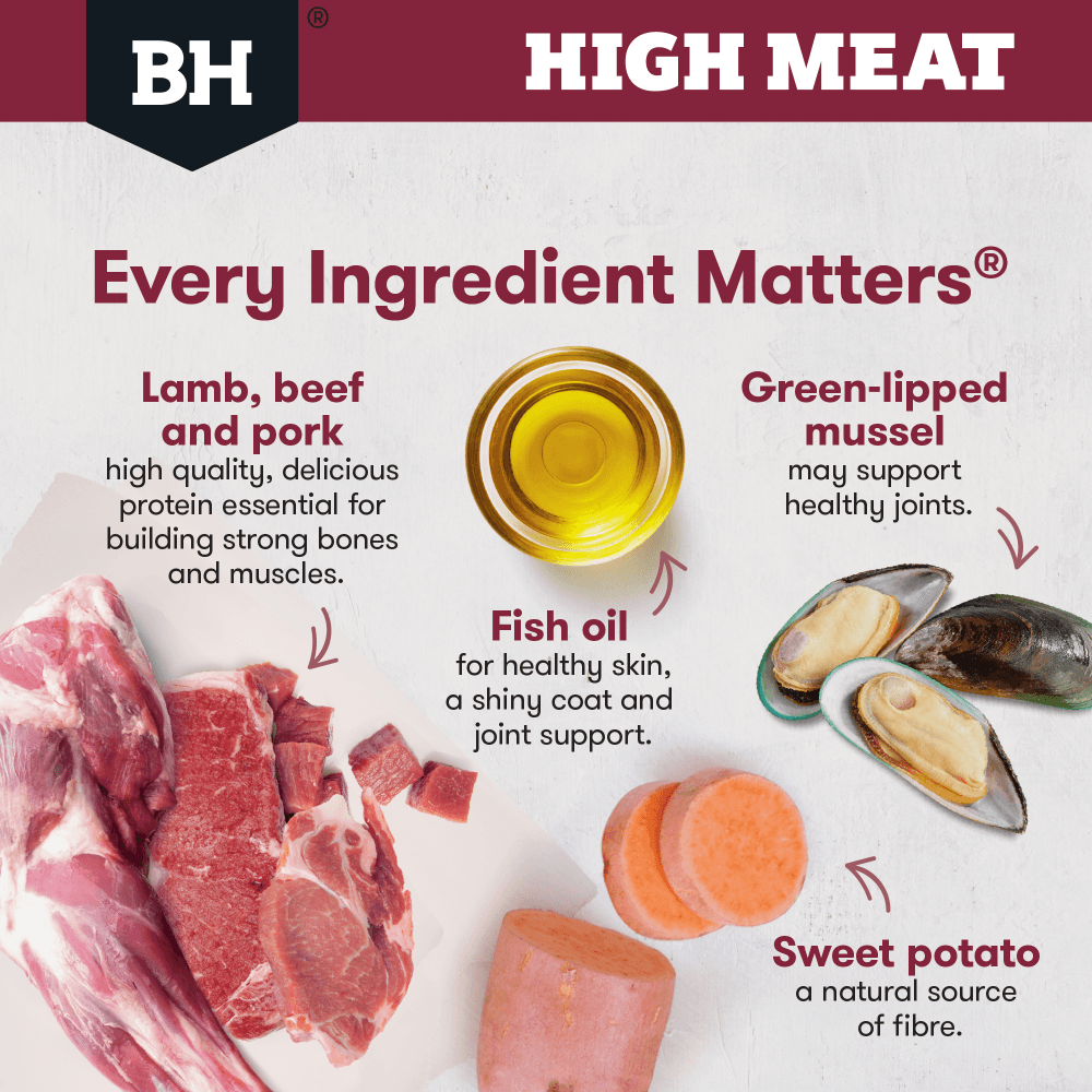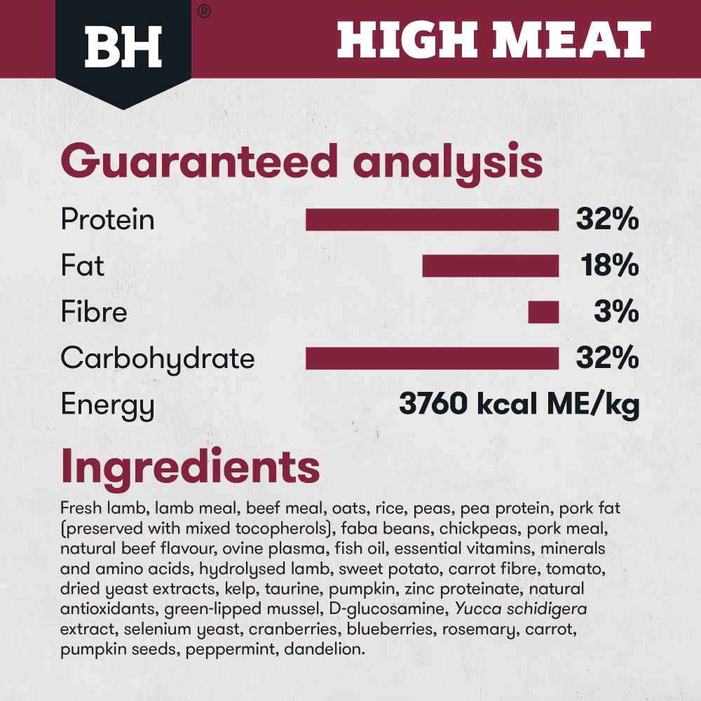 Fresh lamb, lamb meal, beef meal, oats, rice, peas, pea protein, pork fat (preserved with mixed tocophererols), faba beans, chickpeas, pork meal, natural beef flavour, ovine plasma, fish oil, essential vitamins, minerals and amino acids (see table), hydrolysed lamb, sweet potato, carrot fibre, tomato, dried yeast extracts, kelp, taurine, pumpkin, zinc proteinate, natural antioxidants, green-lipped mussel, D-glucosamine, Yucca schidigera extract, selenium yeast, cranberries, blueberries, rosemary, carrot, pumpkin seeds, peppermint, dandelion