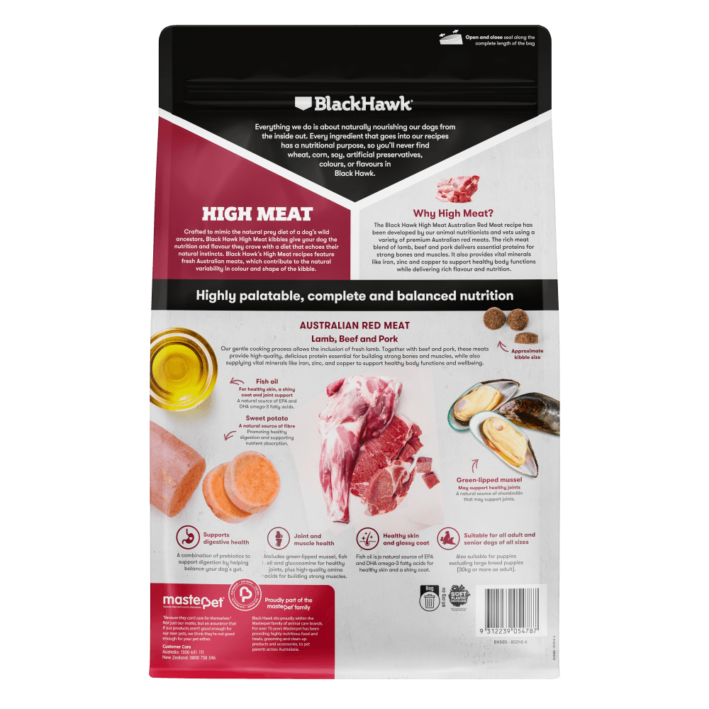 The Black Hawk High Meat Australian Red Meat is a premium, high-protein dry food designed to satisfy your dog's ancestral cravings with a rich blend of red meats. This complete and balanced, poultry-free recipe features 65% real Australian lamb, beef, and pork to support strong muscles and overall vitality.