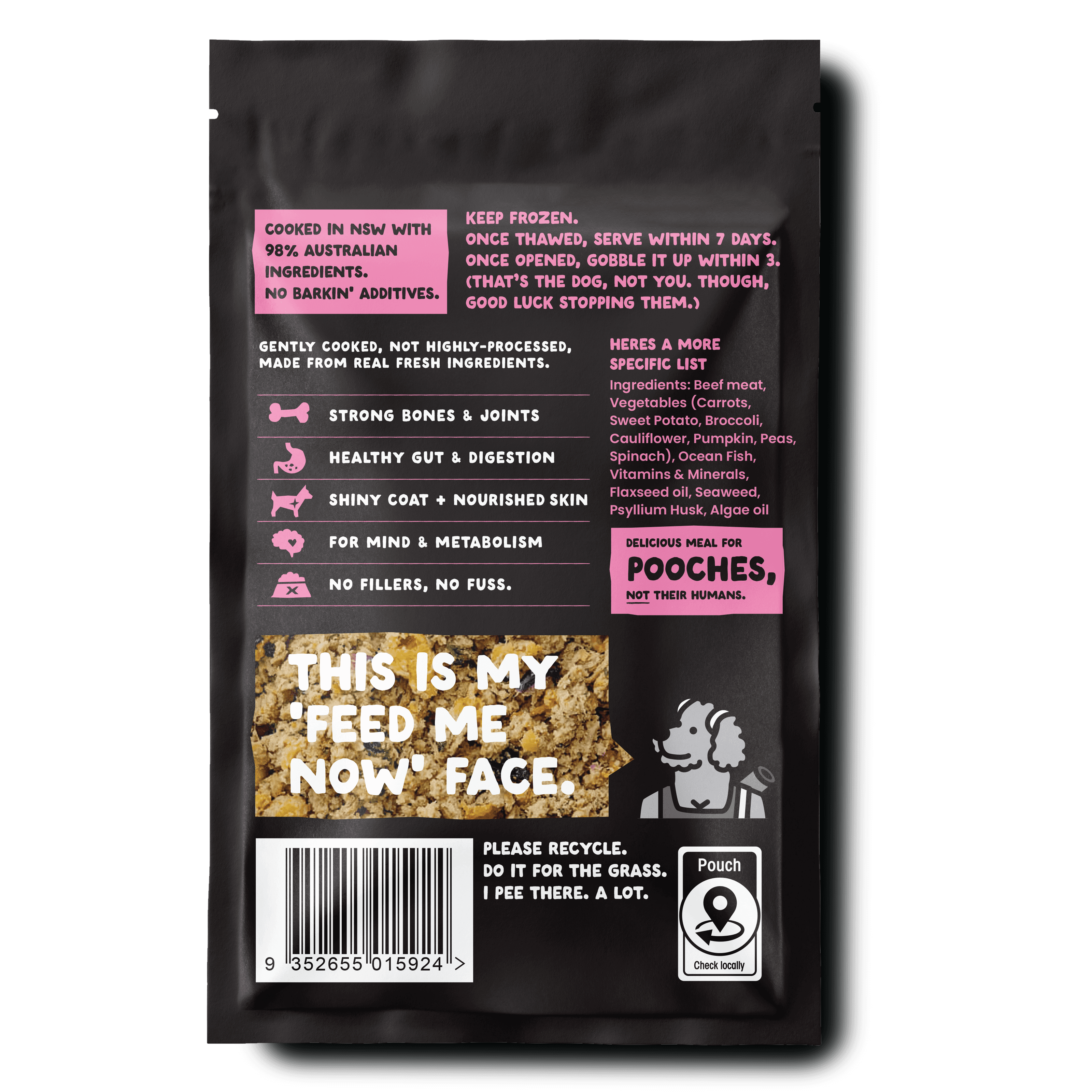 Beef meat 70%, Vegetables (Carrots, Sweet Potato, Broccoli, Cauliflower, Pumpkin, Peas, Spinach), Ocean Fish (incl. Salmon) 8%, Vitamins & Minerals, Flaxseed oil, Seaweed, Psyllium Husk, Algae oil