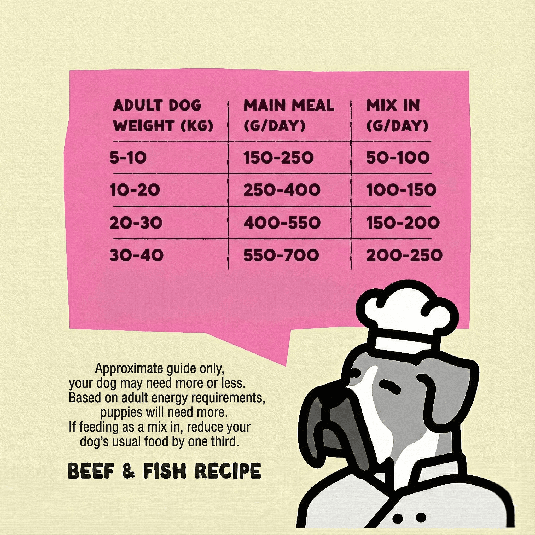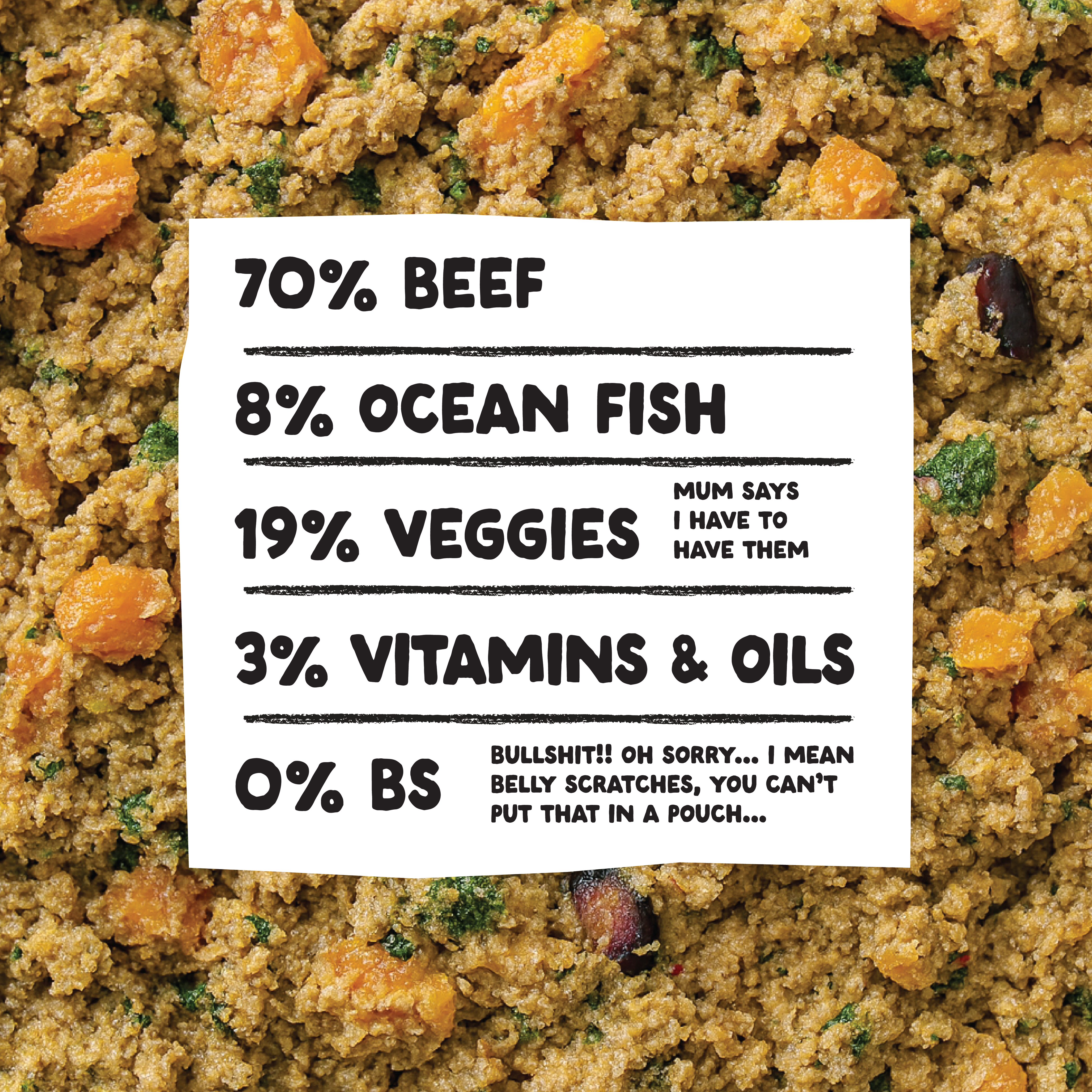 Beef meat 70%, Vegetables (Carrots, Sweet Potato, Broccoli, Cauliflower, Pumpkin, Peas, Spinach), Ocean Fish (incl. Salmon) 8%, Vitamins & Minerals, Flaxseed oil, Seaweed, Psyllium Husk, Algae oil