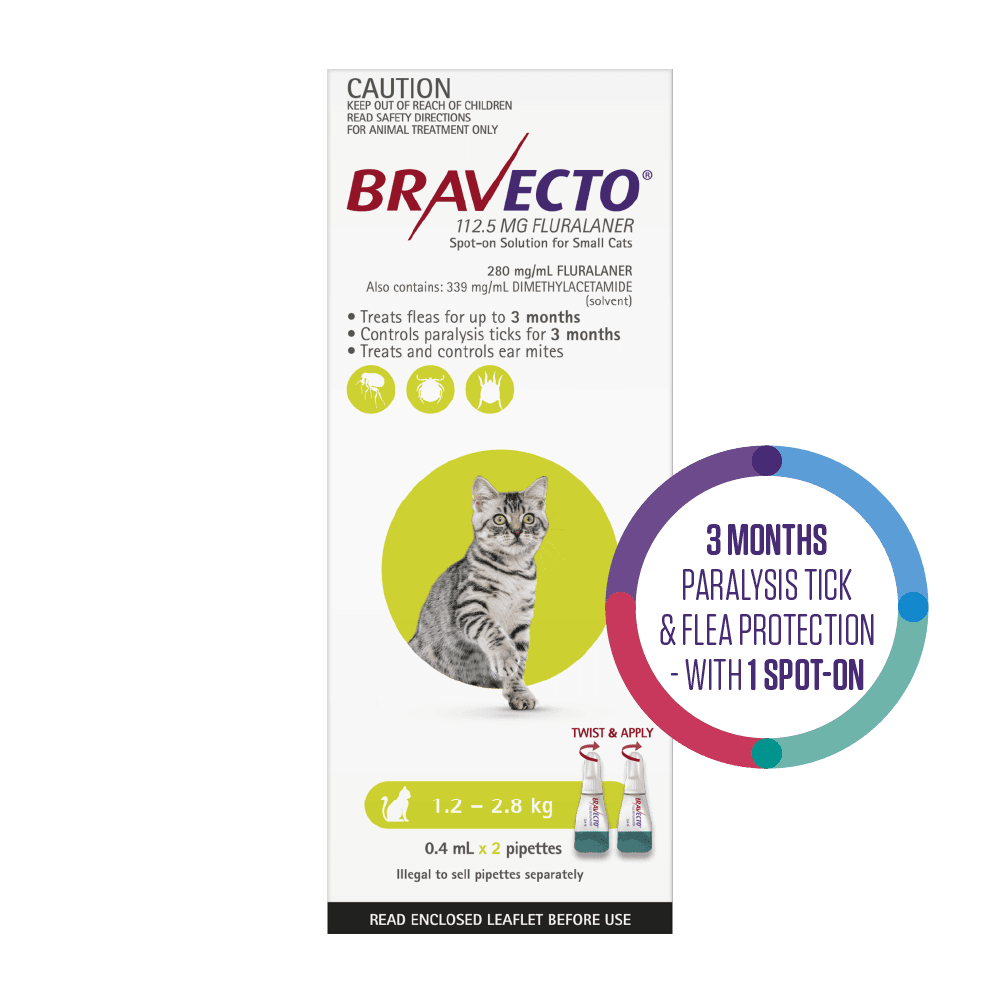 Bravecto Green Spot On for Small Cats (1.2 to 2.8kg) offers essential protection against fleas and paralysis ticks for three months with a simple topical application. It also helps control flea allergy dermatitis and ear mites.