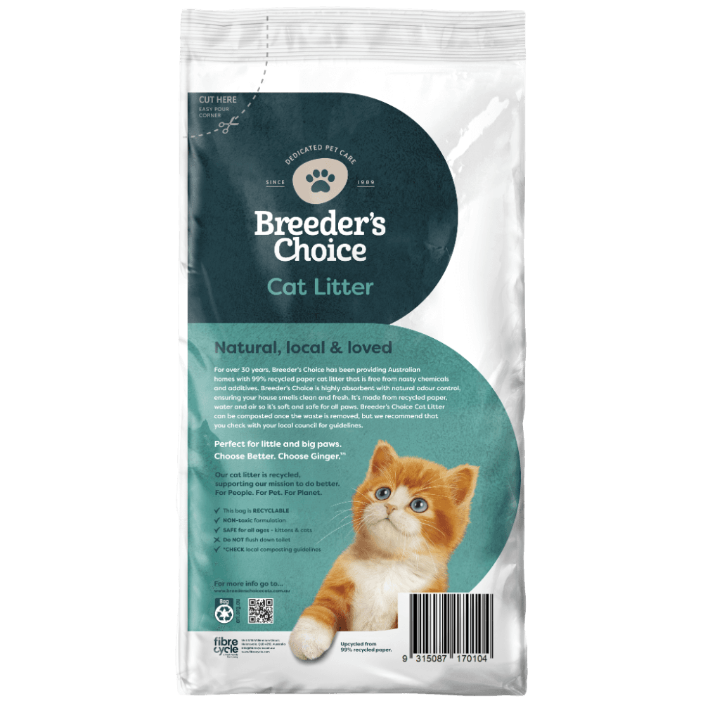 This Breeder's Choice cat litter offers pet parents a sustainable choice, crafted primarily from recycled paper with superior absorbency and natural odour-controlling properties. It is an ecological and economical solution, free from harmful additives or chemicals, making it a safe option for your cat and kind to the environment.