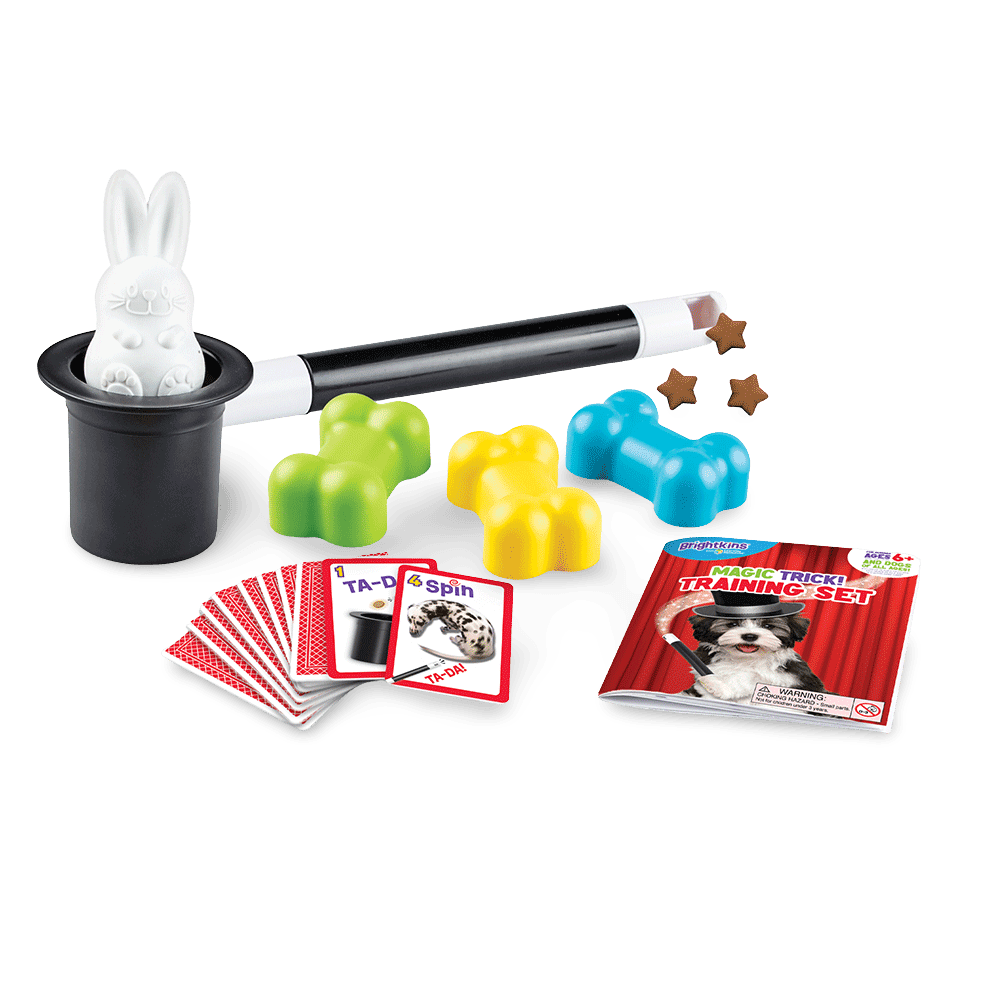 Brightkins Magic Trick Training SetBrightkins pet toys are designed to keep your pet busy both physically and mentally. This toy comes with atreat wand, shell game bones, treat rabbit and top hat, training cards and an expert guide. All of which help to teach them new tricks while utilising the included toys.
