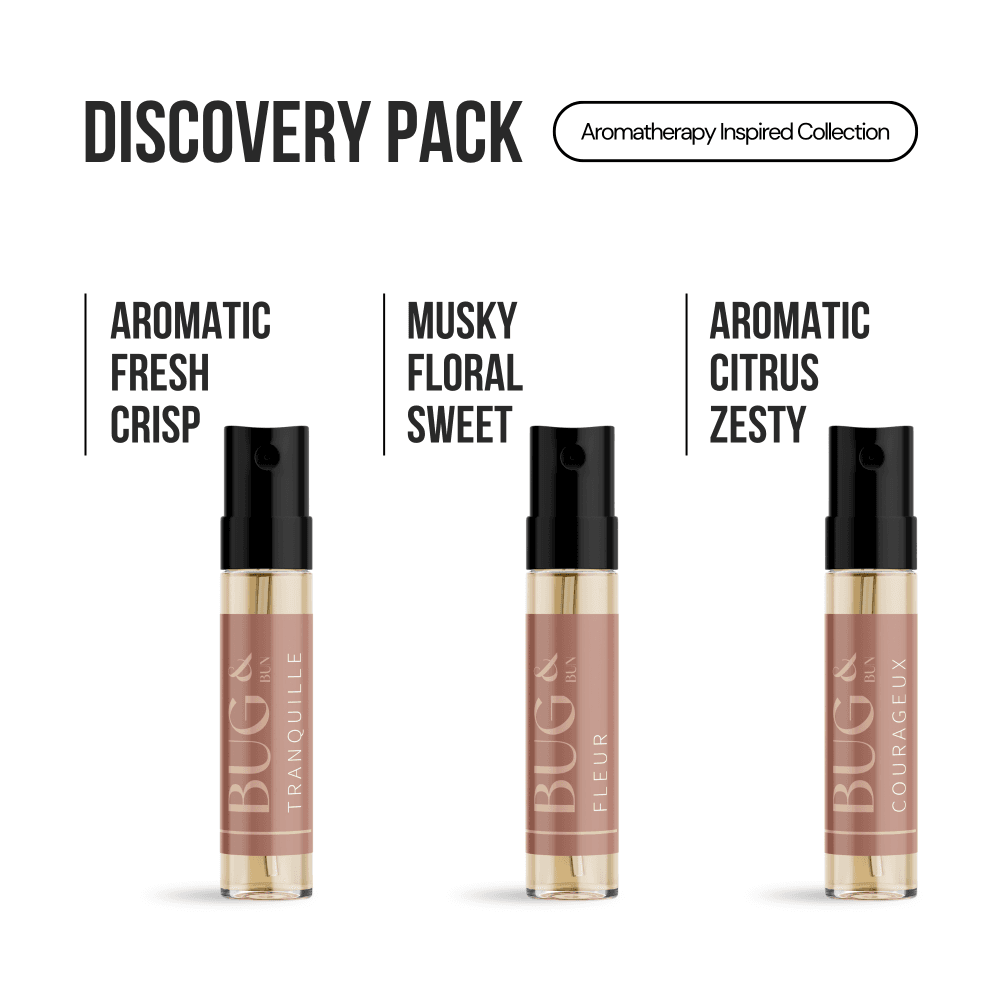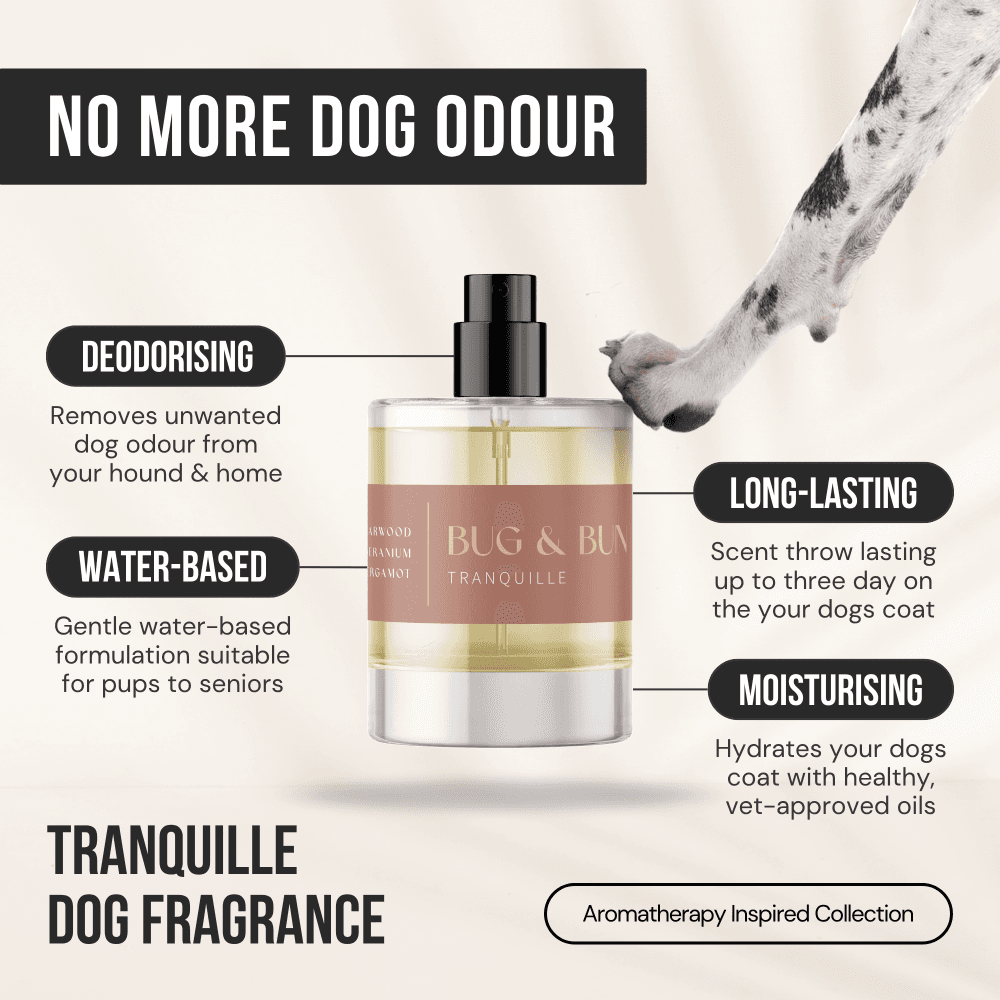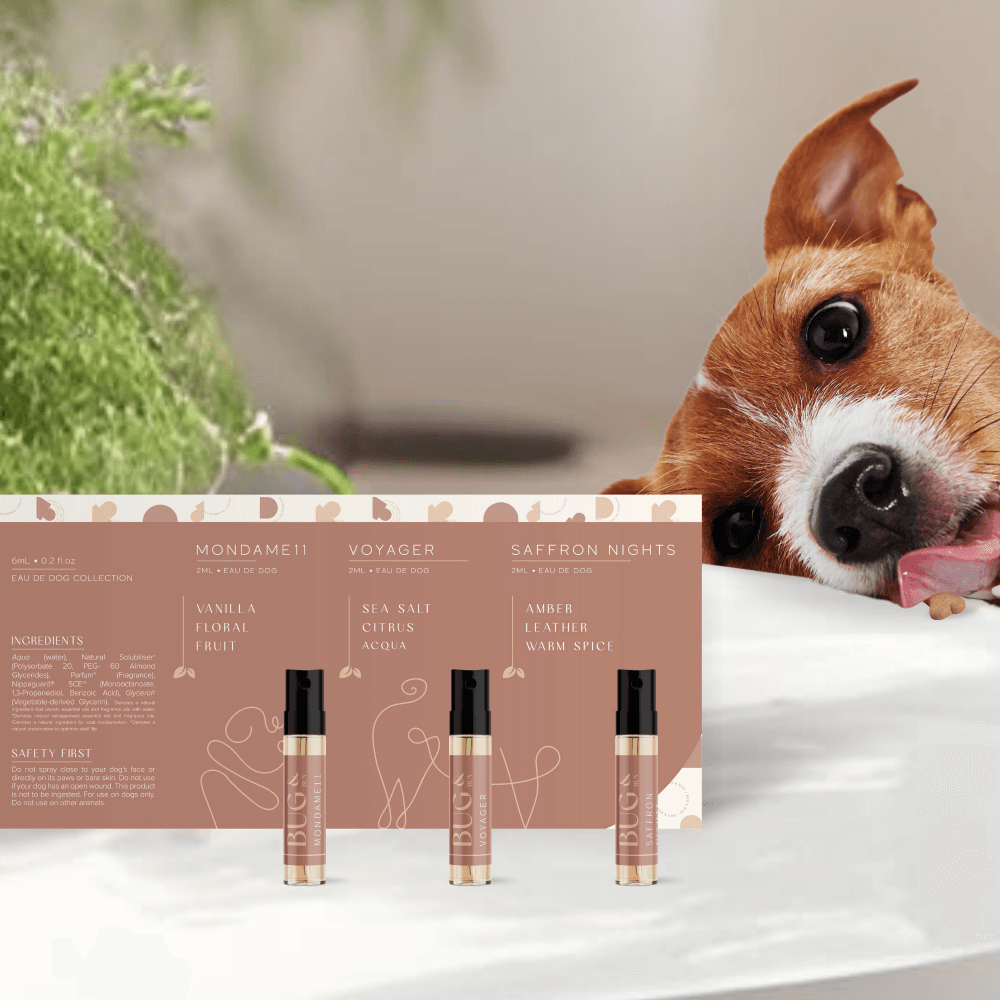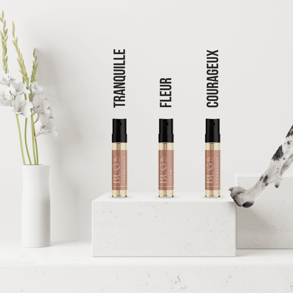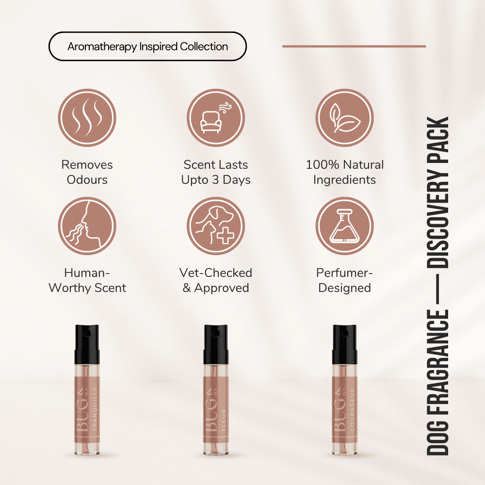 Introducing the Bug & Bun Eau de Natural Discovery Pack, featuring three aromatic 3ml fragrance samples from the 'Eau de Natural' collection - Fleur, Tranquille and Courageux. These unique dog perfumes are designed to deodorise while enhancing your home with calming and refreshing scents. Each fragrance is infused with natural, therapeutic essential oils that are perfect for use on your dog's coat, bedding, crates, and around the home as a room spray.