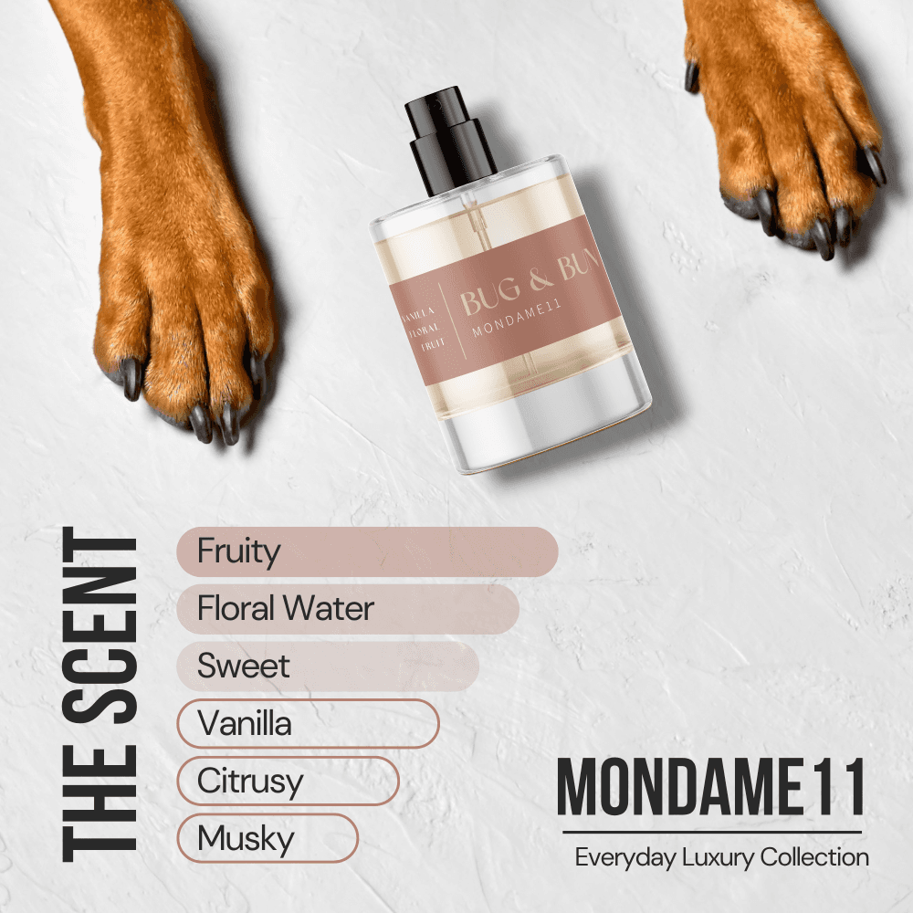 Introducing the Bug & Bun Fragrance Dog Deodorising Spray Mondame11, part of the Eau De Dog Collection. This elegant 50 ml spray is the perfect way to keep your dog'smelling fresh and luxurious. With a delicate blend of vanilla, floral, and fruity notes, Mondame11 offers a warm, soothing, and silky fragrance that lasts up to 3 days. Whether you're looking to deodorise between washes or enhance your dog's grooming routine, this spray is the ideal choice for dog owners who appreciate a touch of elegance.