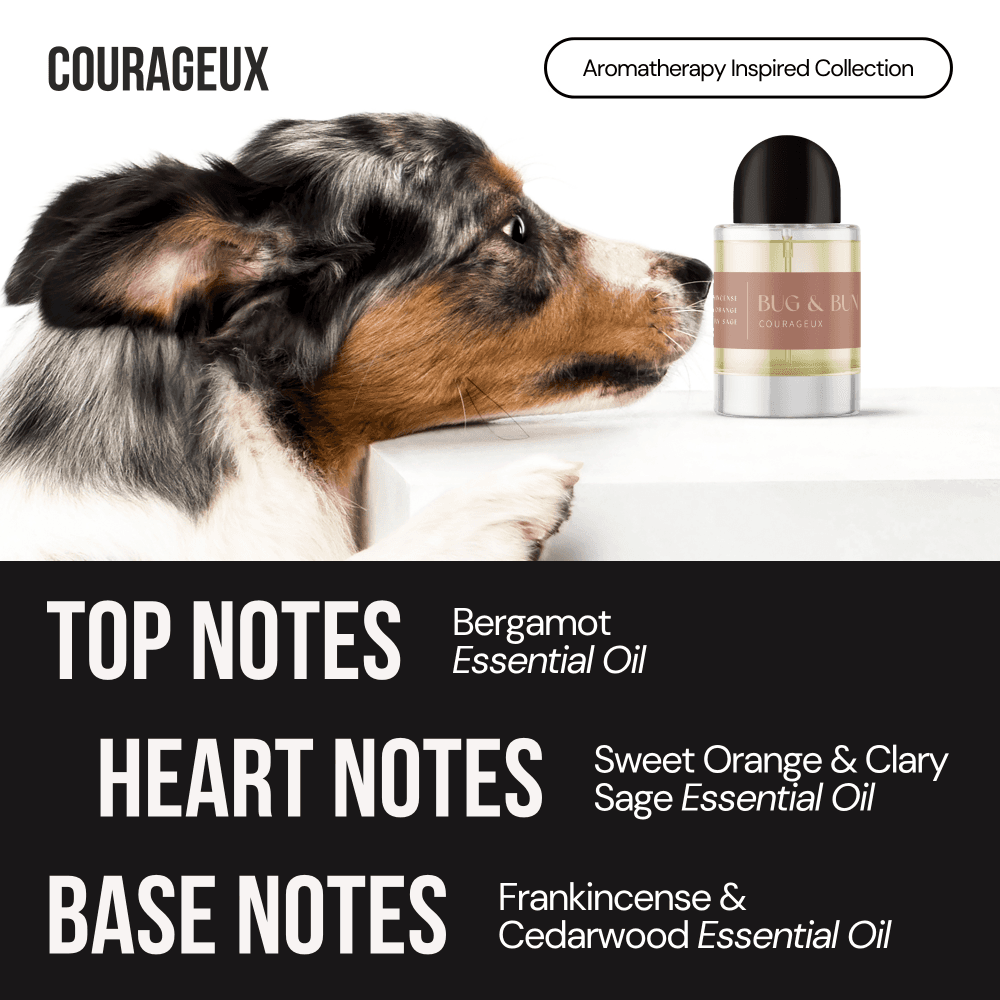 Aqua (filtered water), Natural Solubiliser (blends water & oil together), Frankincense Essential Oil (boswellia carterii), Sweet Orange Essential Oil (Citrus sinensis), Himalayan Cedarwood Essential Oil (Cedrus deodara), Bergamot Non-Phototoxic Essential Oil (Citrus aurantium var. bergamia), Clary Sage Essential Oil (Salvia sclarea), Natural Preservative (for maximum longevity), Vegetable Glycerin (for a silky-smooth coat).