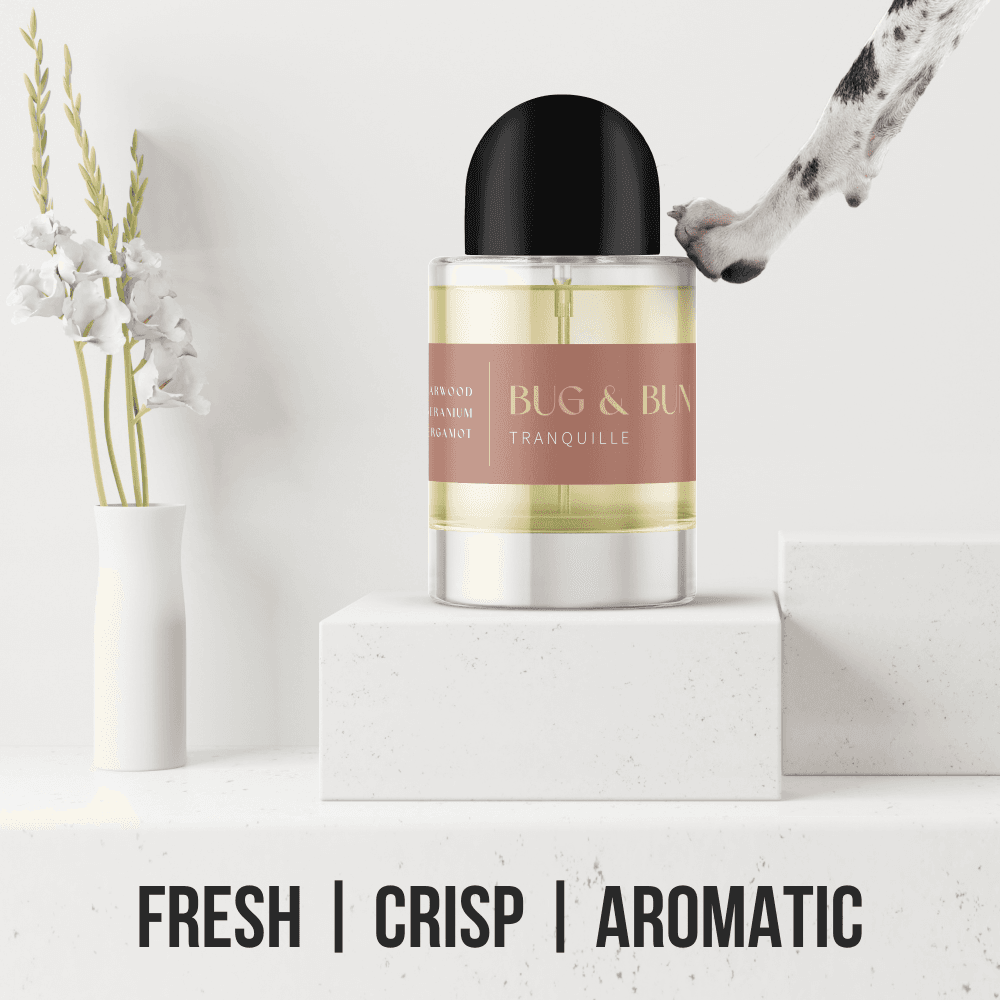 Introducing Tranquille by Bug & Bun, the 100% natural dog fragrance designed to calm your pup with every spritz. Part of the 'Eau de Natural' collection, this fresh, citrus, and aromatic perfume combines essential oils renowned for their soothing and stress-relieving properties. With heart notes of French Lavender, Rose Geranium, and Clary Sage, Tranquille helps relieve anxiety and tension, while base notes of Himalayan Cedarwood and Frankincense create a fresh, invigorating foundation. Perfect for deodorising your dog and providing a moment of calm, Tranquille is a must-have for any pampered pooch.