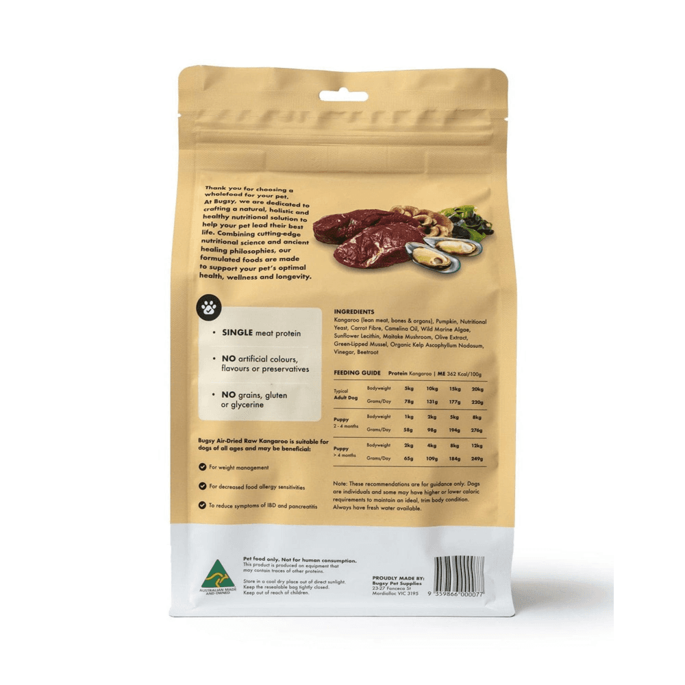 Kangaroo (Lean Meat, Bones & Organs), Pumpkin, Nutritional Yeast, Carrot fibre, Camelina Oil, Wild Marine Algae, Sunflower Lecithin, Maitake Mushroom, Olive Extract, Green-Lipped Mussel, Organic Kelp Ascophyllum Nodosum, Vinegar, Beetroot.