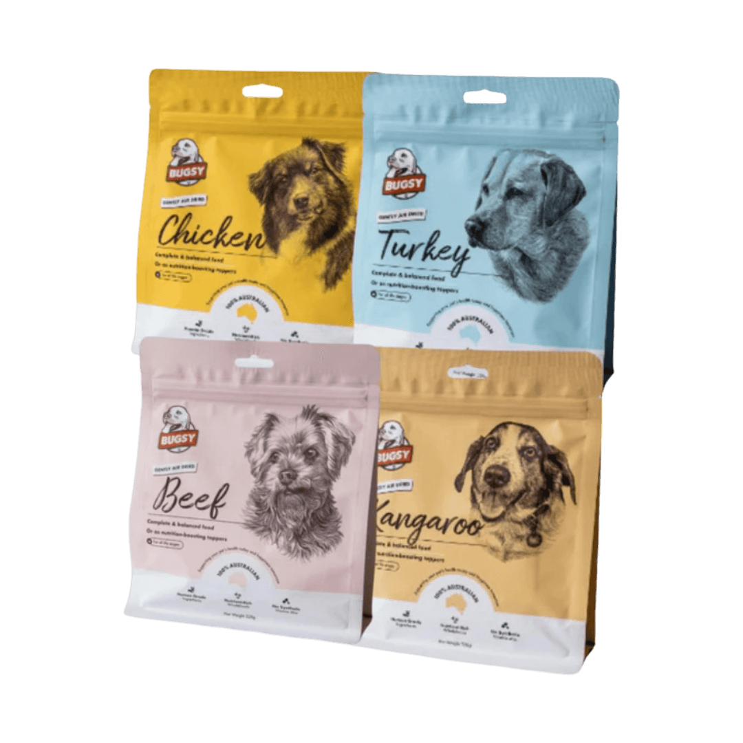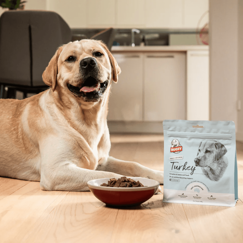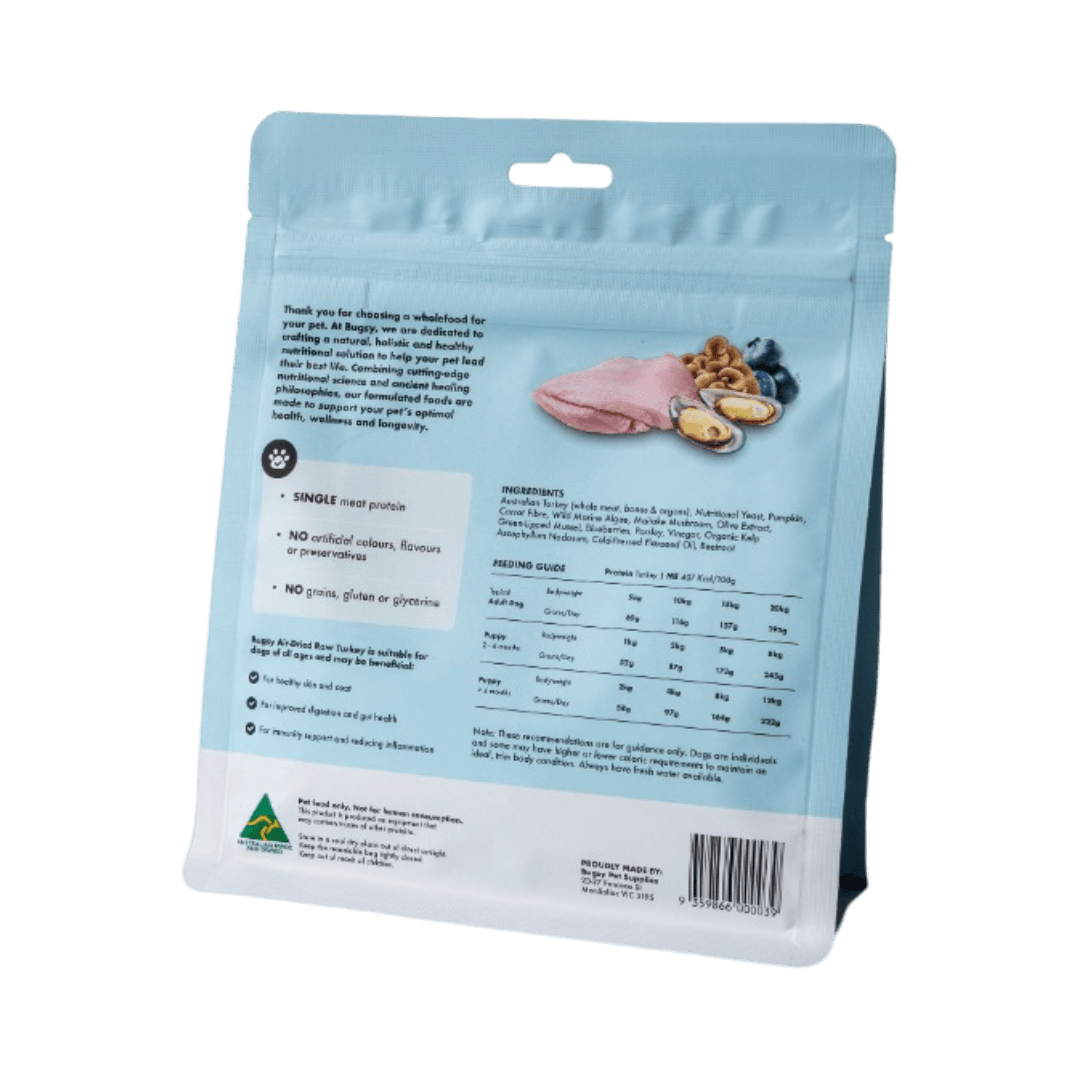 Bugsy Air-Dried Turkey Dry Dog Food is a nutrient-rich, complete and balanced meal designed to support your dog's overall wellbeing. Made with gently air-dried, human-grade Australian turkey, it's ideal for dogs with allergies, sensitive stomachs, or those needing weight management, and also works beautifully as a high-reward topper or training treat.