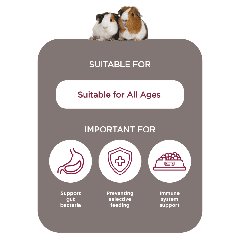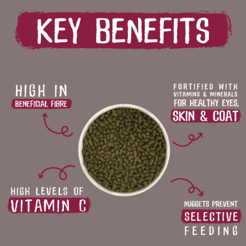 Wheat, grass meal, wheat feed, oatfeed, dried peas, pea protein, dried beet pulp, pea fibre, lignocellulose, yeast (brewer’s yeast and grains), minerals, sunflower oil, short chain fructo-oligosaccharides (prebiotic FOS; 0.25%), maize, dried dandelion root (0.05%), dried passion flower (0.05%), camomile powder (0.05%)