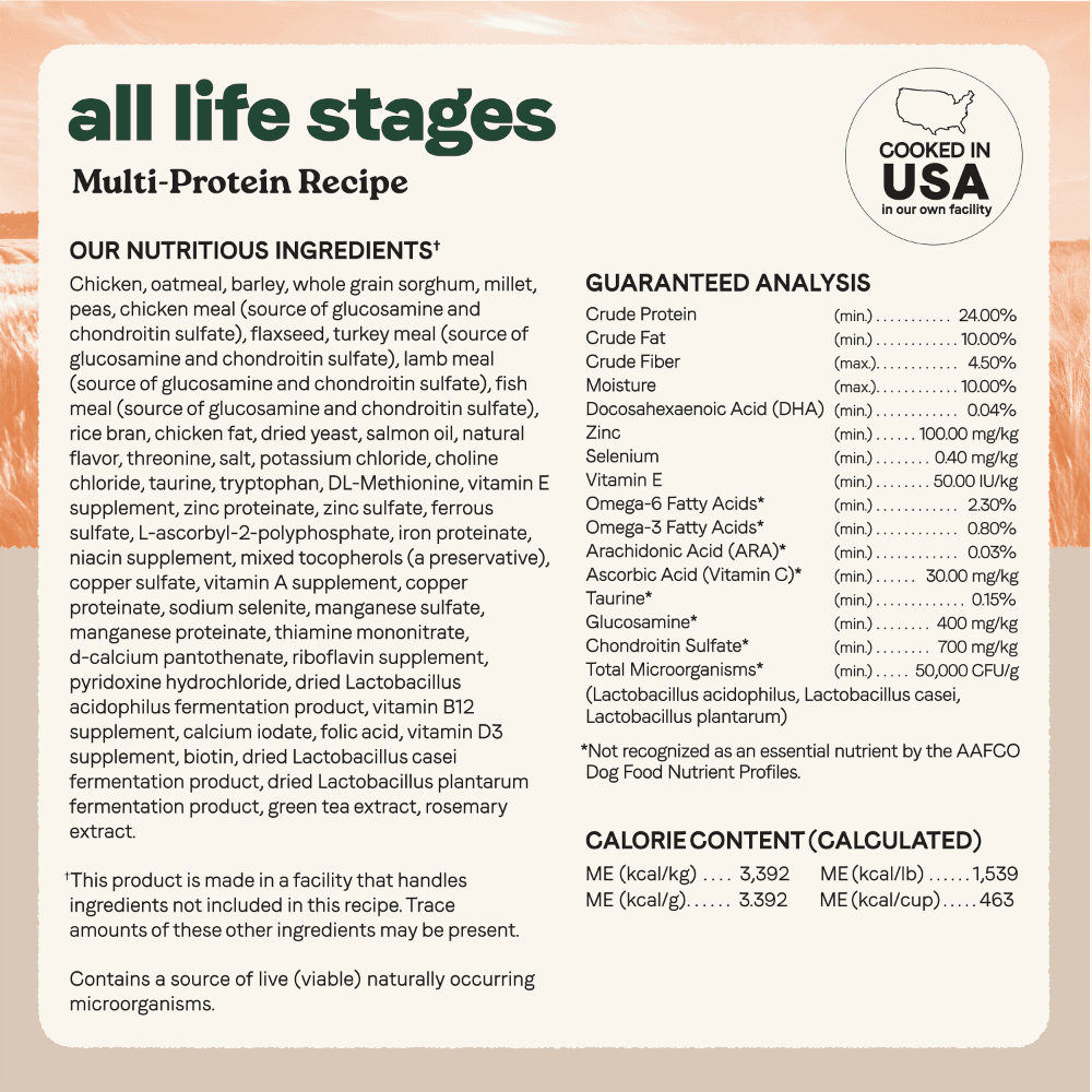 Chicken, Oatmeal, Barley, Whole Grain Sorghum, Millet, Peas, Chicken Meal (Source Of Glucosamine And Chondroitin Sulfate), Flaxseed, Turkey Meal (Source Of Glucosamine And Chondroitin Sulfate), Lamb Meal (Source Of Glucosamine And Chondroitin Sulfate), Fish Meal (Source Of Glucosamine And Chondroitin Sulfate), Rice Bran, Chicken Fat, Dried Yeast, Salmon Oil, Natural Flavour, Threonine, Salt, Potassium Chloride, Choline Chloride, Taurine, Tryptophan, Dl-Methionine, Vitamin E Supplement, Zinc Proteinate, Zinc Sulfate, Ferrous Sulfate, L-Ascorbyl-2-Polyphosphate, Iron Proteinate, Niacin Supplement, Mixed Tocopherols (A Preservative), Copper Sulfate, Vitamin A Supplement, Copper Proteinate, Sodium Selenite, Manganese Sulfate, Manganese Proteinate, Thiamine Mononitrate, D-Calcium Pantothenate, Riboflavin Supplement, Pyridoxine Hydrochloride, Dried Lactobacillus Acidophilus Fermentation Product, Vitamin B12 Supplement, Calcium Iodate, Folic Acid, Vitamin D3 Supplement, Biotin, Dried Lactobacillus Casei Fermentation Product, Dried Lactobacillus Plantarum Fermentation Product, Green Tea Extract, Rosemary Extract